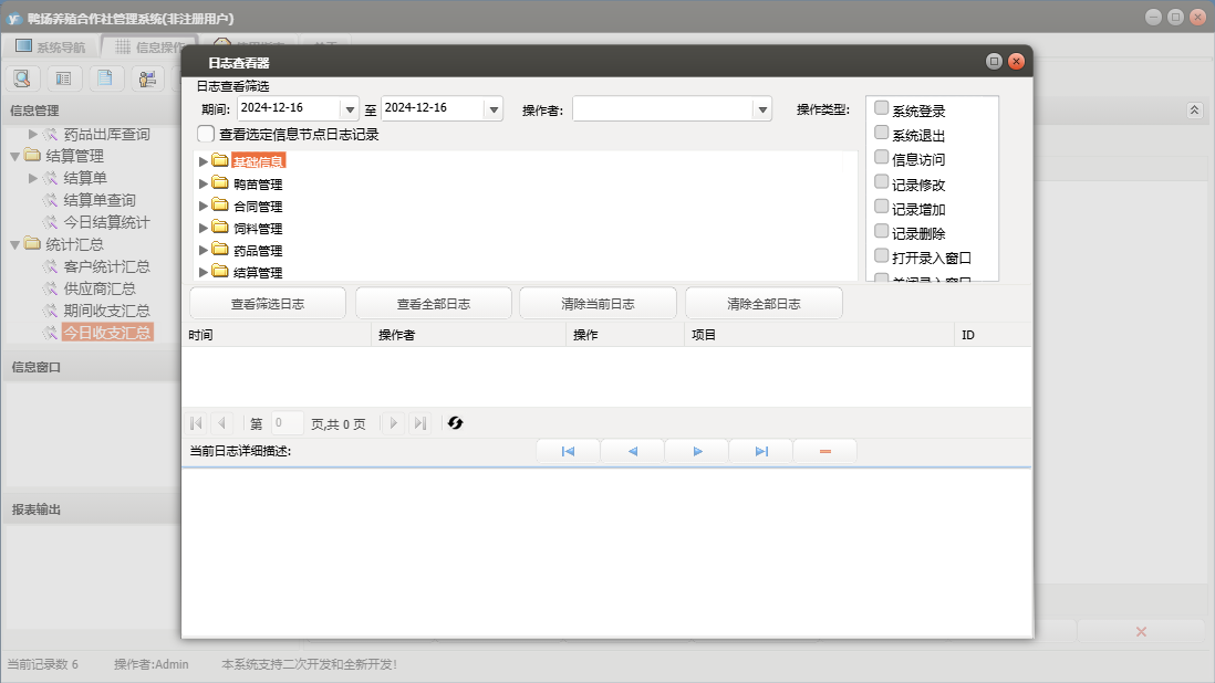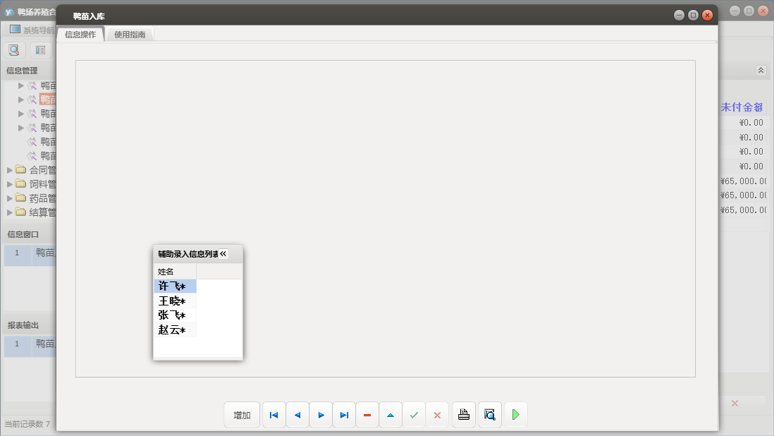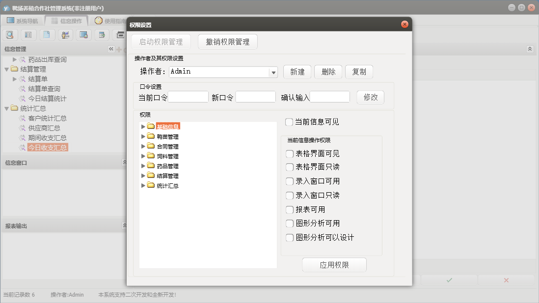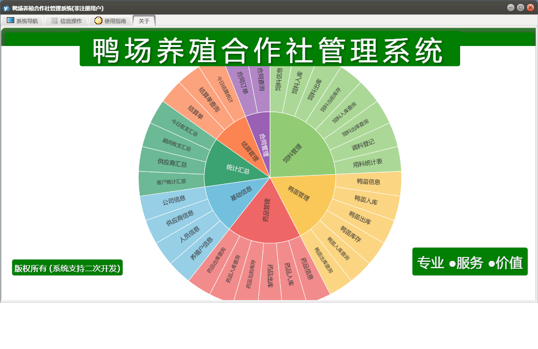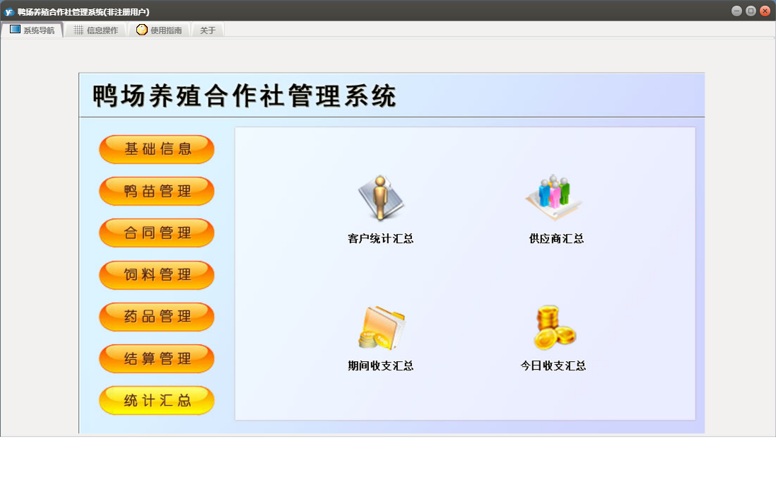 鸭场养殖合作社管理系统包含以下功能:合同订单、鸭苗入库、药品管理、统计汇总、调料登记、药品入库、结算单、养殖户信息、权限设置、饲料信息、供应商信息、药品信息、结算管理、鸭苗信息、关于、合同管理、药品出库、饲料管理、基础信息、鸭苗管理、鸭苗出库、日志、饲料出库、饲料入库、人员信息等