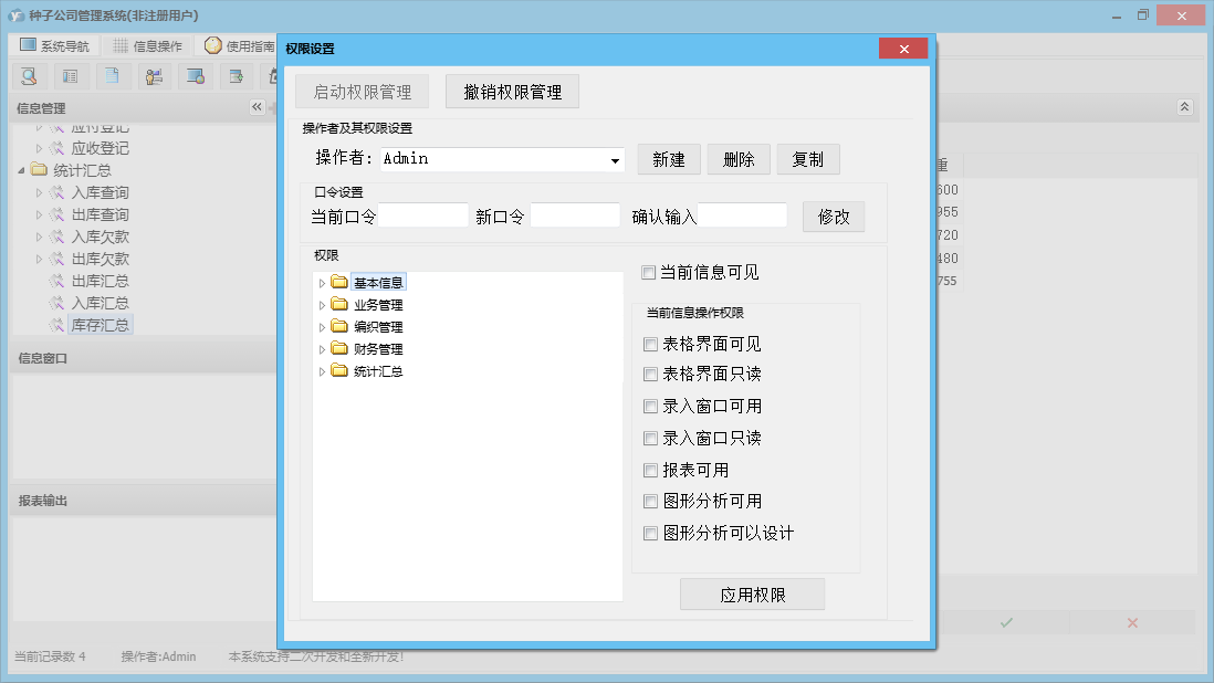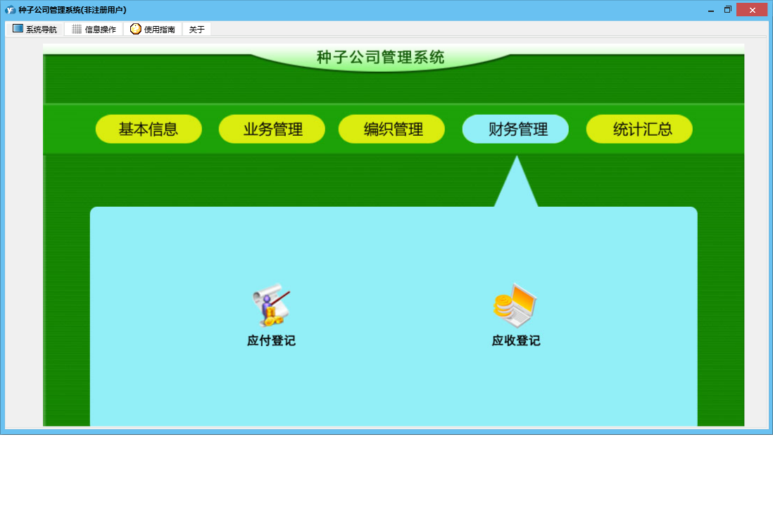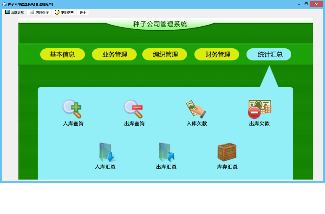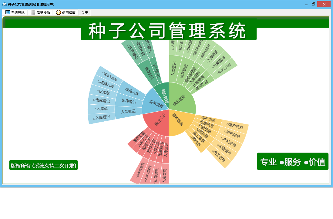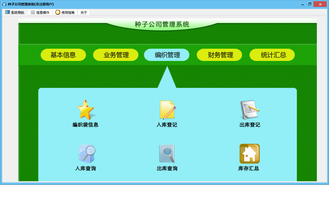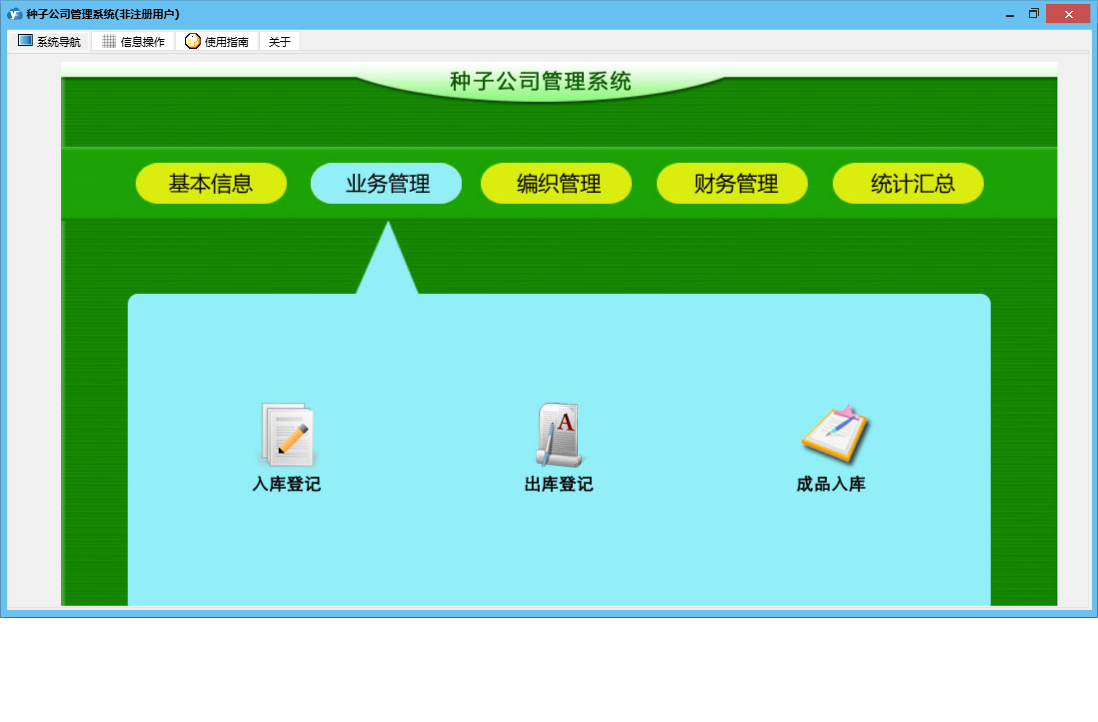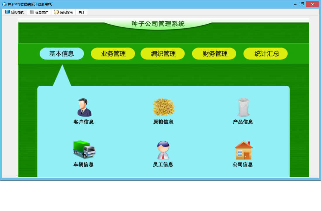 种子公司管理系统包含以下功能:出库登记、应收登记、原粮信息、产品信息、统计汇总、财务管理、成品入库、应付登记、入库登记、权限设置、编织管理、关于、基本信息、客户信息、业务管理、车辆信息、员工信息、日志、编织袋信息等