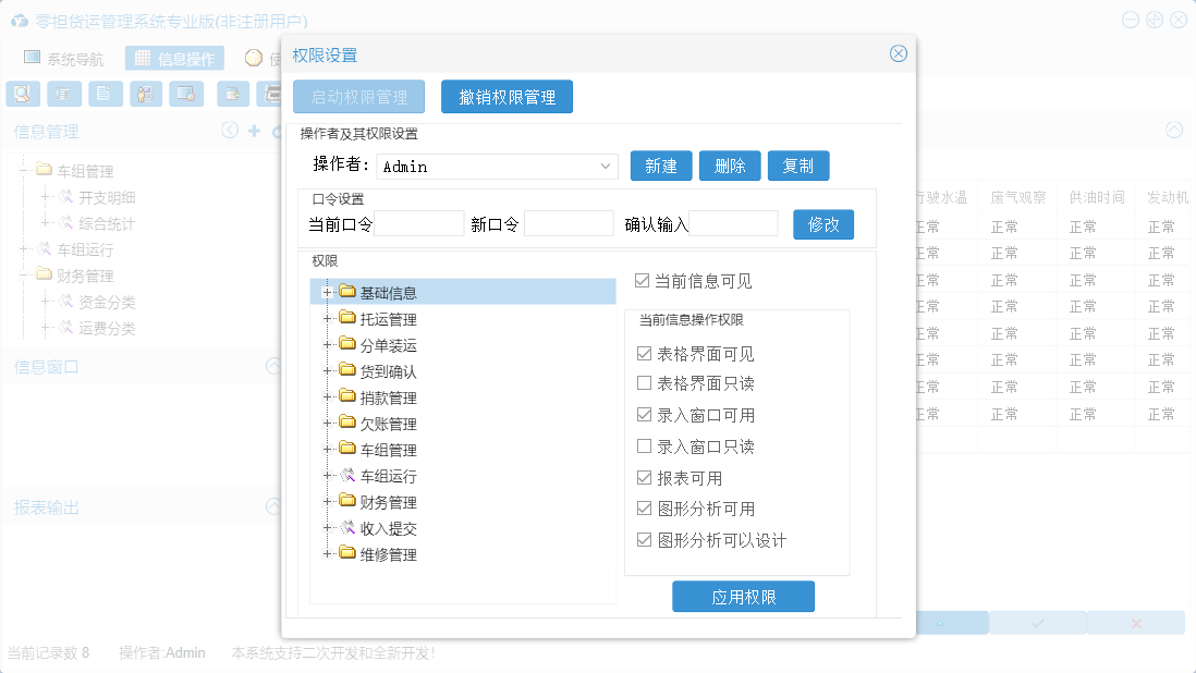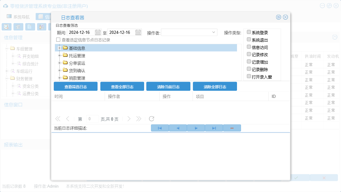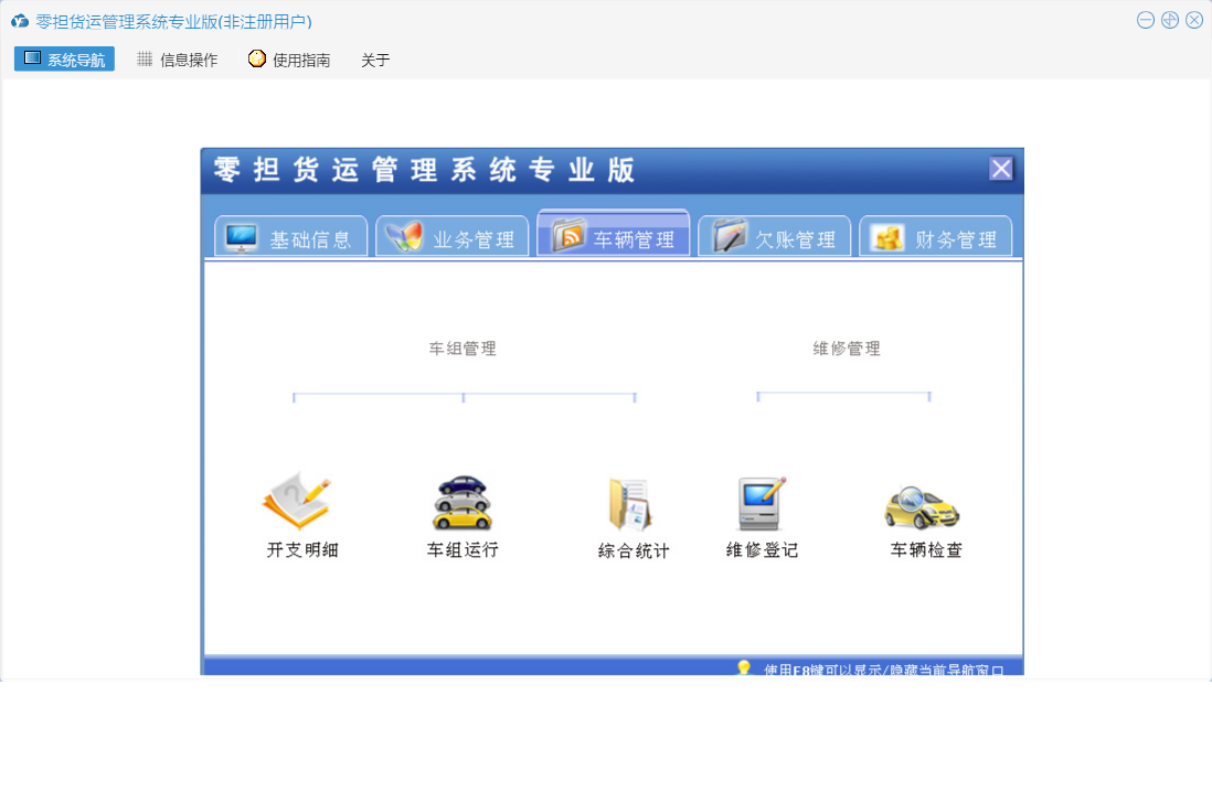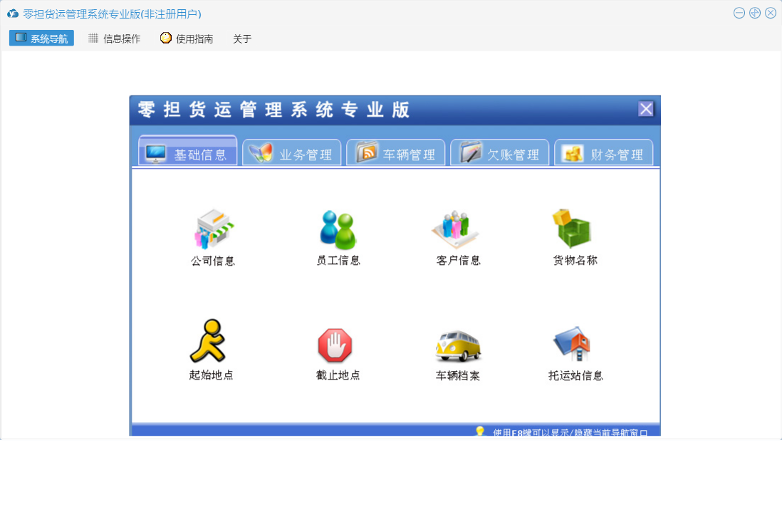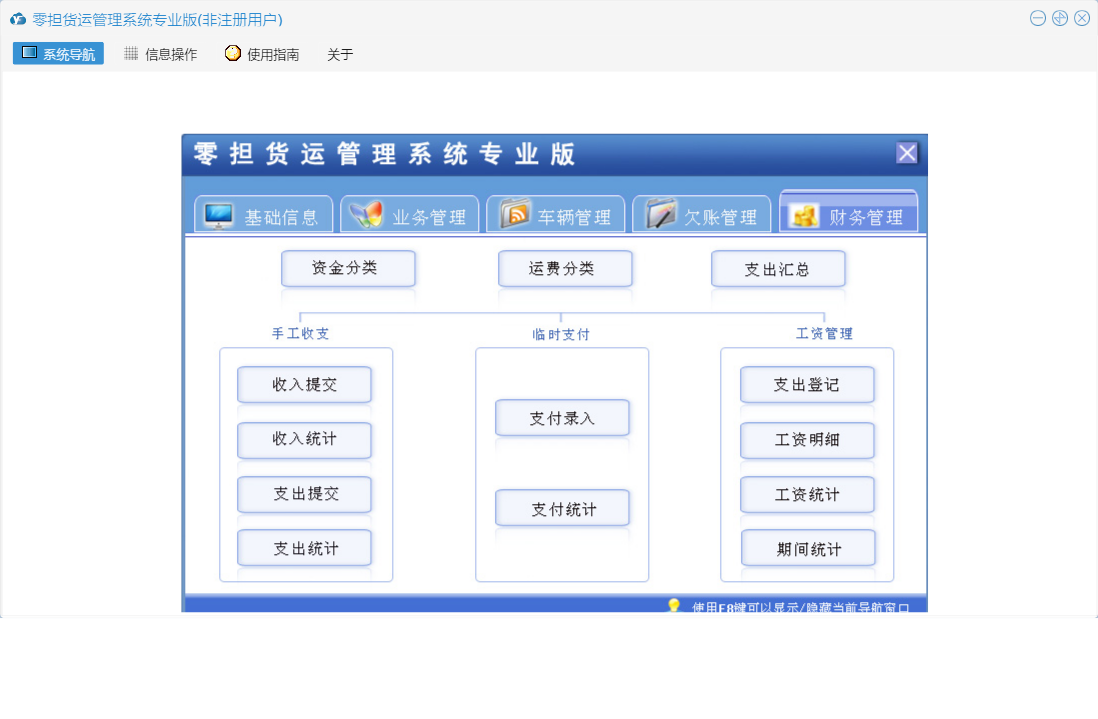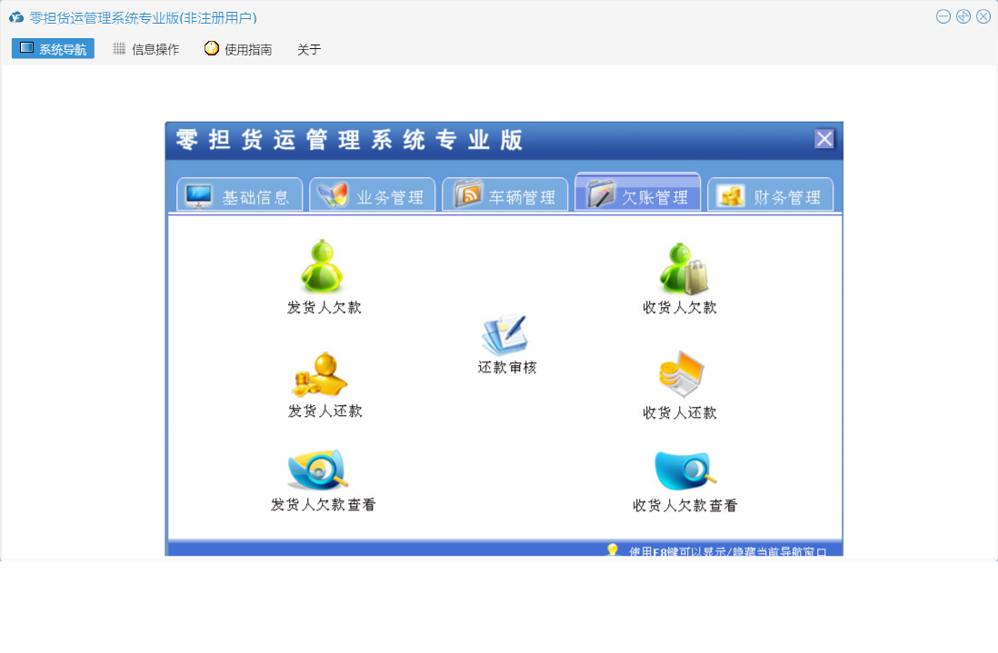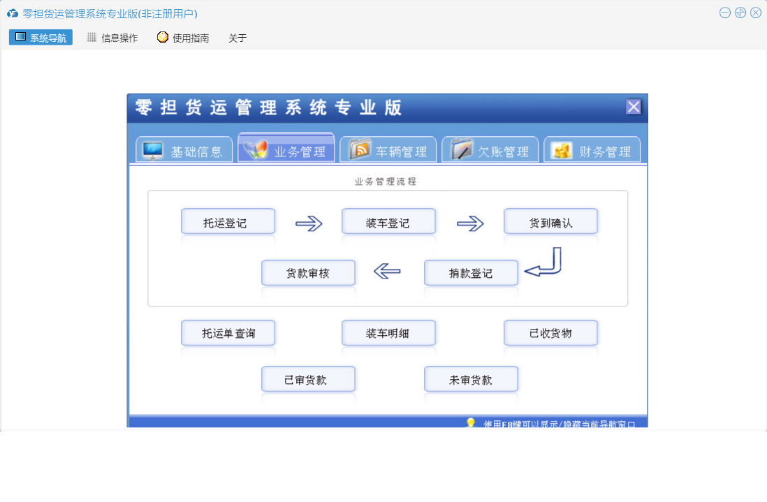 零担货运管理系统专业版包含以下功能:货到确认、货款审核、开支明细、维修登记、托运登记、装车登记、车辆管理、财务管理、还款审核、截止地点、托运站信息、支付录入、捎款登记、欠账管理、公司信息、发货人还款、权限设置、货物名称、车组运行、支出登记、关于、车辆检查、客户信息、收货人还款、车辆档案、业务管理、支出提交、基础信息、起始地点、员工信息、收入提交、日志等