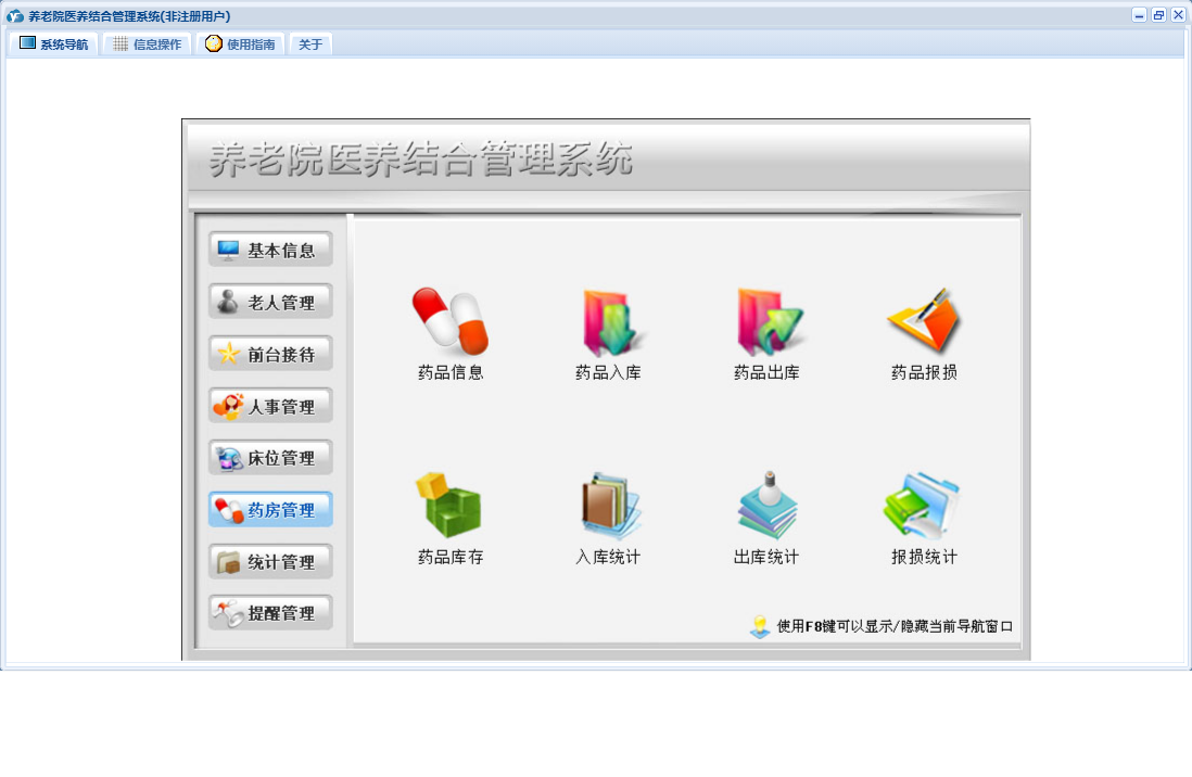 养老院医养结合管理系统包含以下功能:提醒管理、来访登记、床位管理、药房管理、人事管理、接待登记、老人资料、前台接待、统计管理、老人信息查询、员工信息查询、入院登记、单位信息、床位查询、交费登记、关于、基本信息、医嘱登记、转房登记、退住登记、生活日志、老人情况一览表、外出登记、病人物品登记、老人管理等