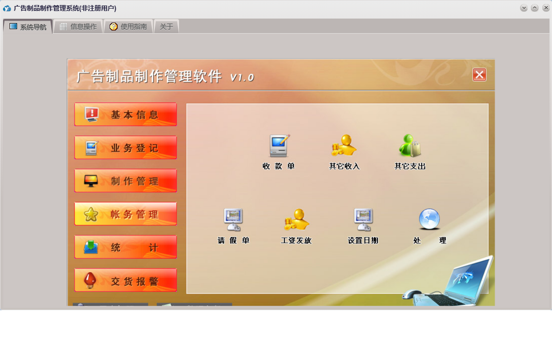 广告制品制作管理系统包含以下功能:接单审核、请假单、其它支出、收款单、业务接单、统计、权限设置、关于、基本信息、帐务管理、客户信息、安装、其它收入、交货报警、制作、工资发放、员工信息、业务登记、日志、接单设计、制作管理等