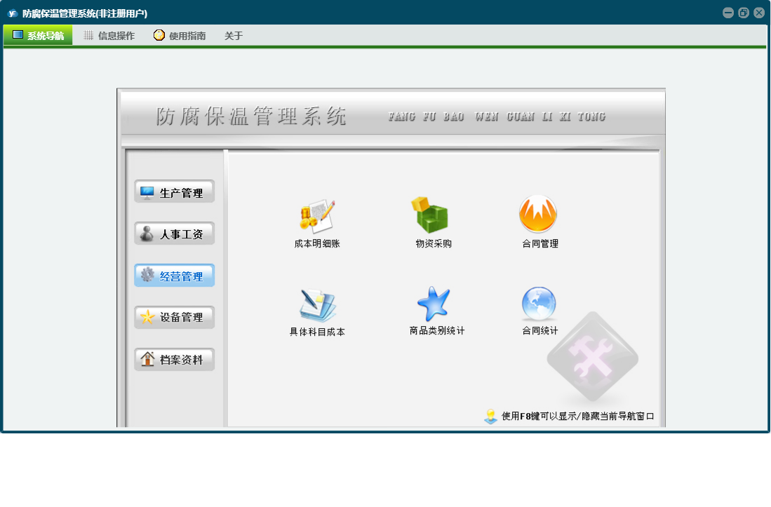 防腐保温管理系统包含以下功能:考核奖惩记录、经营管理、人事工资、成本明细账、设备检修记录、加工测绘零部件、设备明细表、权限设置、相关单位信息、档案资料、生产线运行记录、关于、合同管理、物资采购、设备管理、人事档案、生产日、工具模具、日志、生产管理、革新改造等