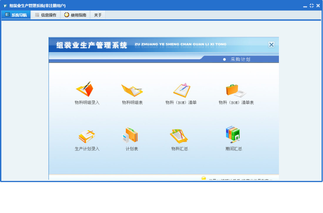 组装业生产管理系统包含以下功能:面板、生产计划、日志、关于、权限设置、物料明细、物料(Bom)清单等