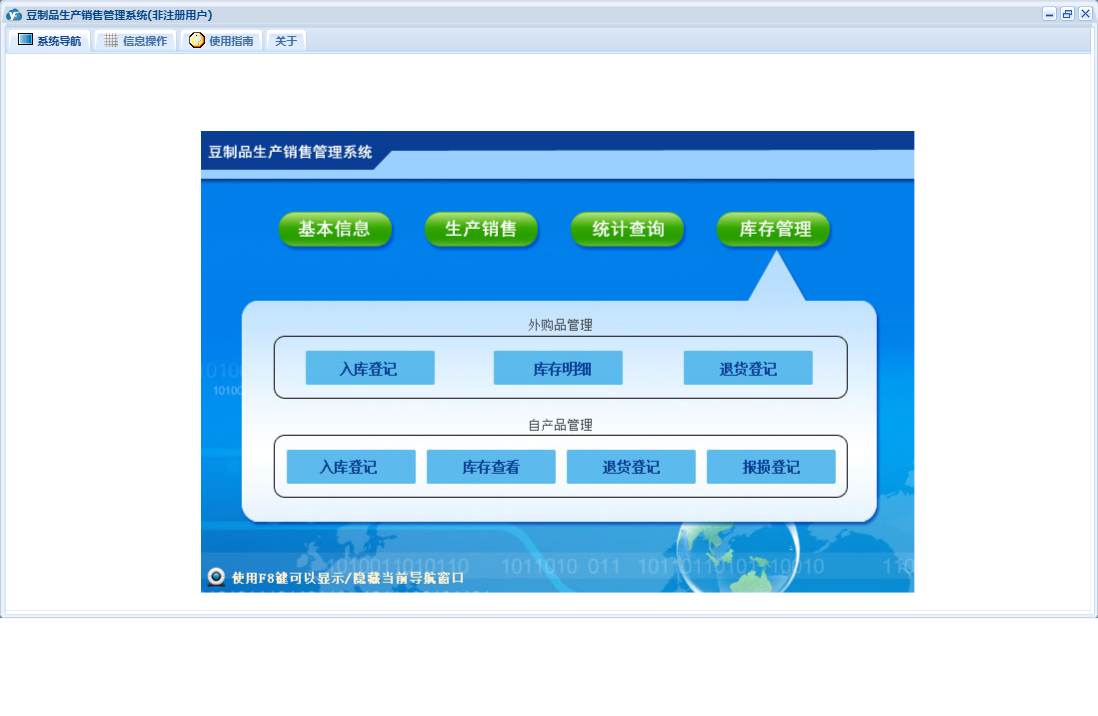 豆制品生产销售管理系统包含以下功能:生产销售、鸡蛋生产成本、外购品信息、黄豆生产成本、入库登记、日志、库存管理、关于、基本信息、统计查询、权限设置、自产品信息、报损登记、退货登记等