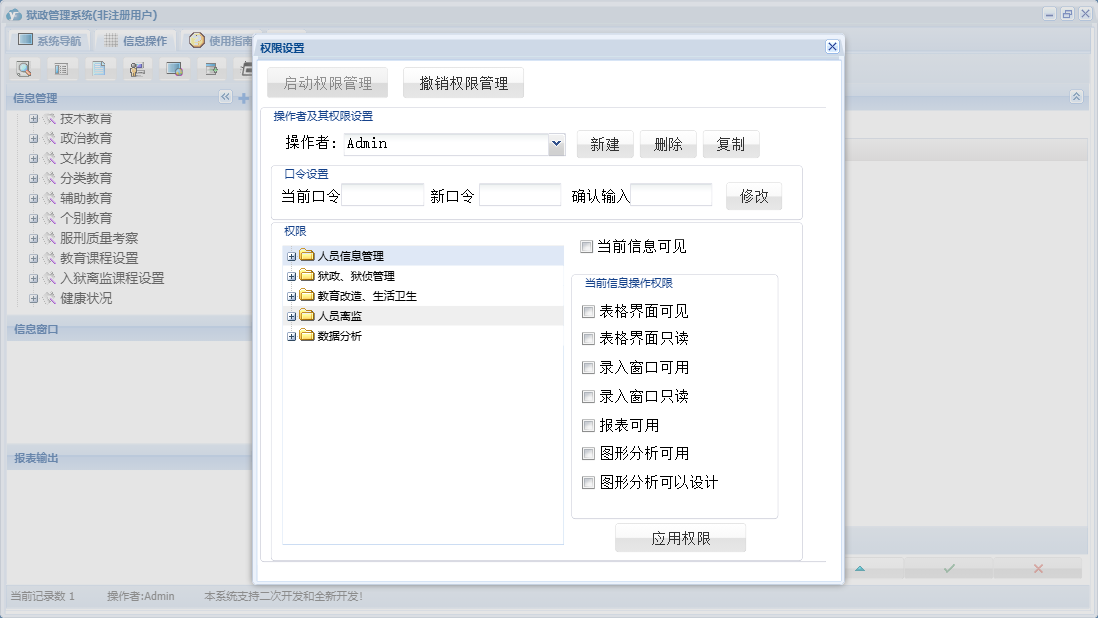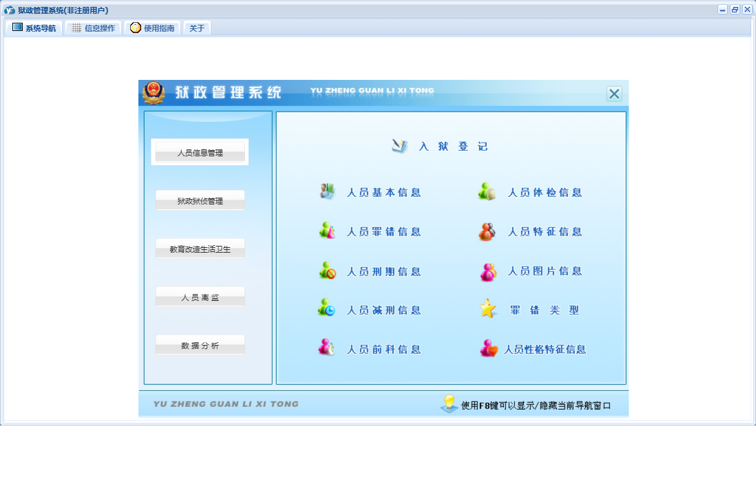 狱政管理系统包含以下功能:教育改造生活卫生、百分考核数据录入、人员离监、文化活动、文化教育、狱外就医、辅助教育、人员减刑信息、危险分子信息、人员管理、正常离监、教育课程设置、人员特征信息、人员死亡、人员体检信息、健康状况、人员基本信息、人员前科信息、耳目人员信息、服刑质量考察、狱政狱侦管理、人员请假、分类教育、权限设置、个人聚餐同居登记、联合帮教信息、入狱离监课程设置、入狱登记、重点罪犯信息、监外执行、人员罪错信息、数据分析、个别教育、奖惩信息、政治教育、关于、申诉与控告、人员图片信息、人员性格特征信息、犯人逃脱、警戒系统、人员刑期信息、技术教育、提前释放、日志、狱内犯罪管理、人员假释、人员信息等