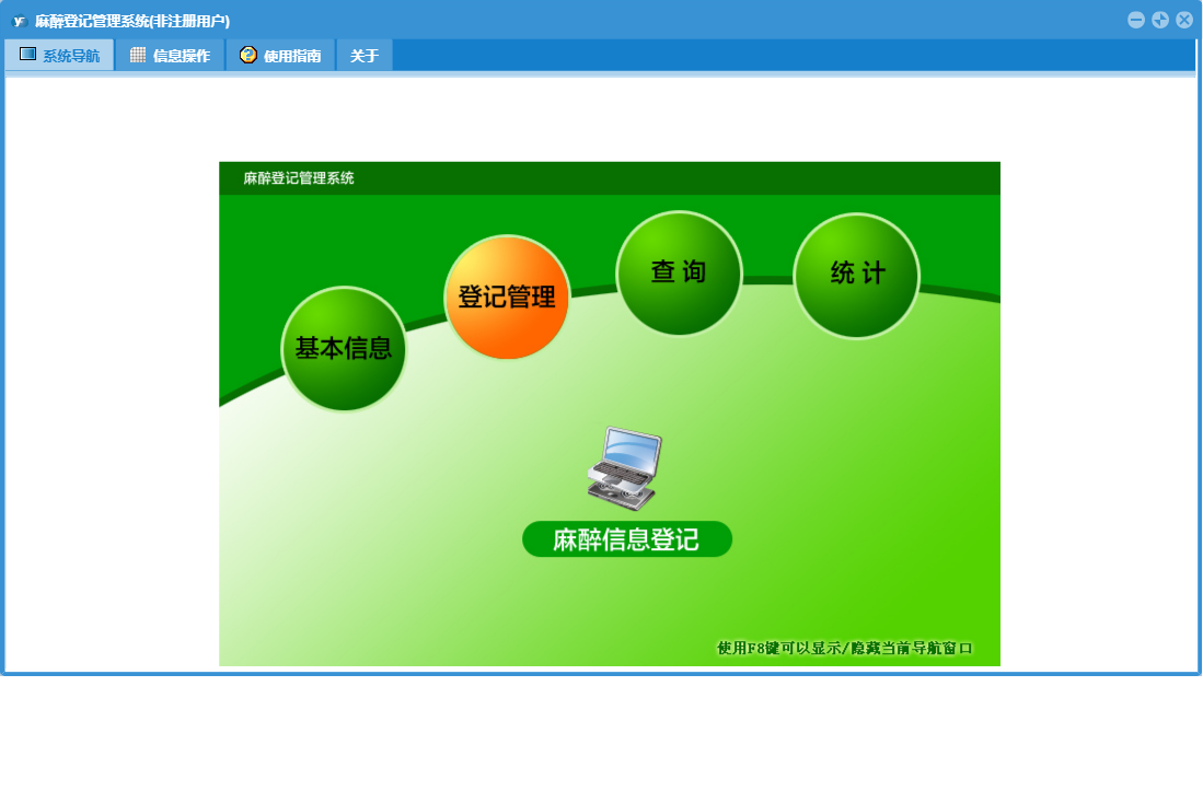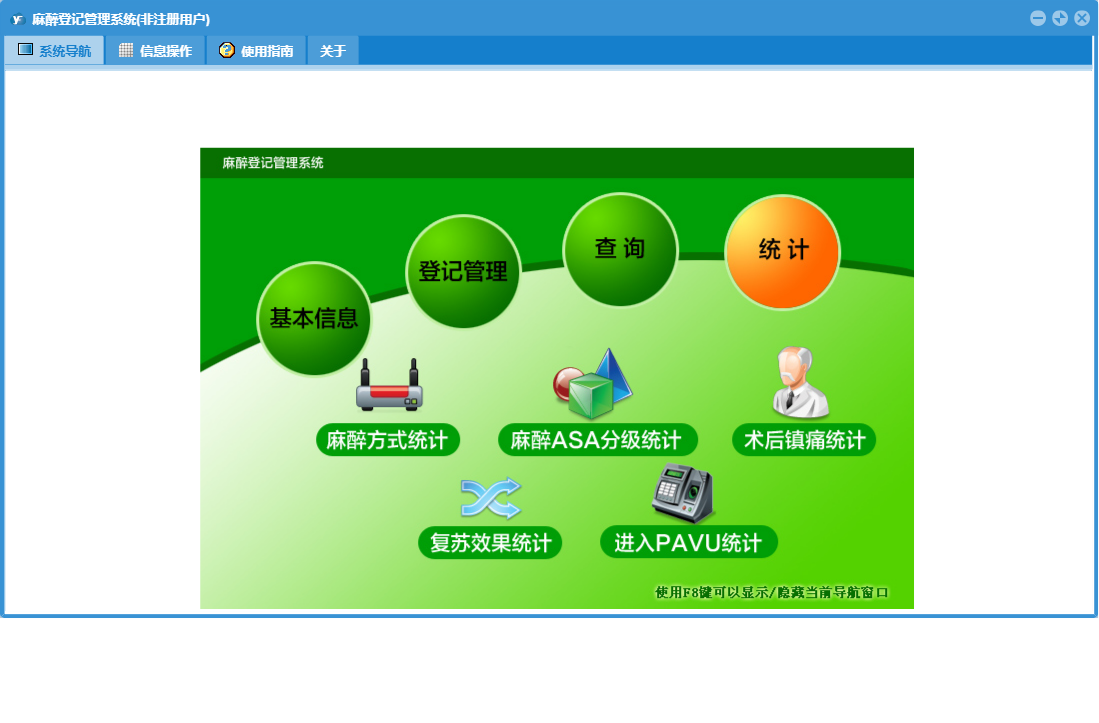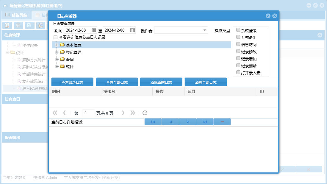 麻醉登记管理系统包含以下功能:查询、员工信息、日志、关于、权限设置、基本信息、麻醉信息登记、统计、登记管理等