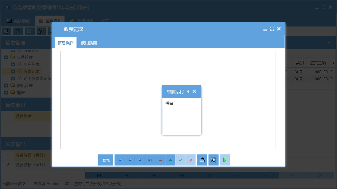 防盗报警收费管理系统包含以下功能:用户信息、基础信息、报警中心信息、收费设置、日志、关于、权限设置、收费记录、移机登记等