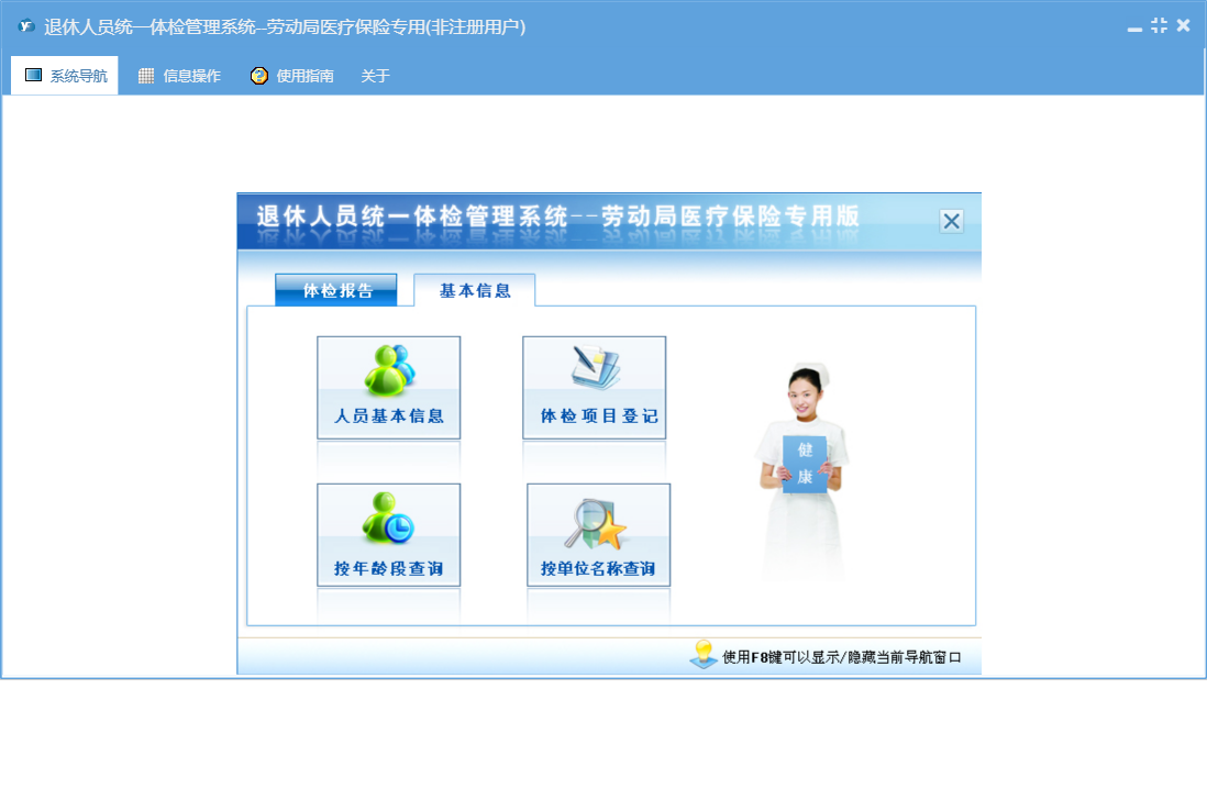 退休人员统一体检管理系统--劳动局医疗保险专用包含以下功能:基础设置、人员基本信息、体检报告录入、体检报告、日志、关于、权限设置、体检项目信息等