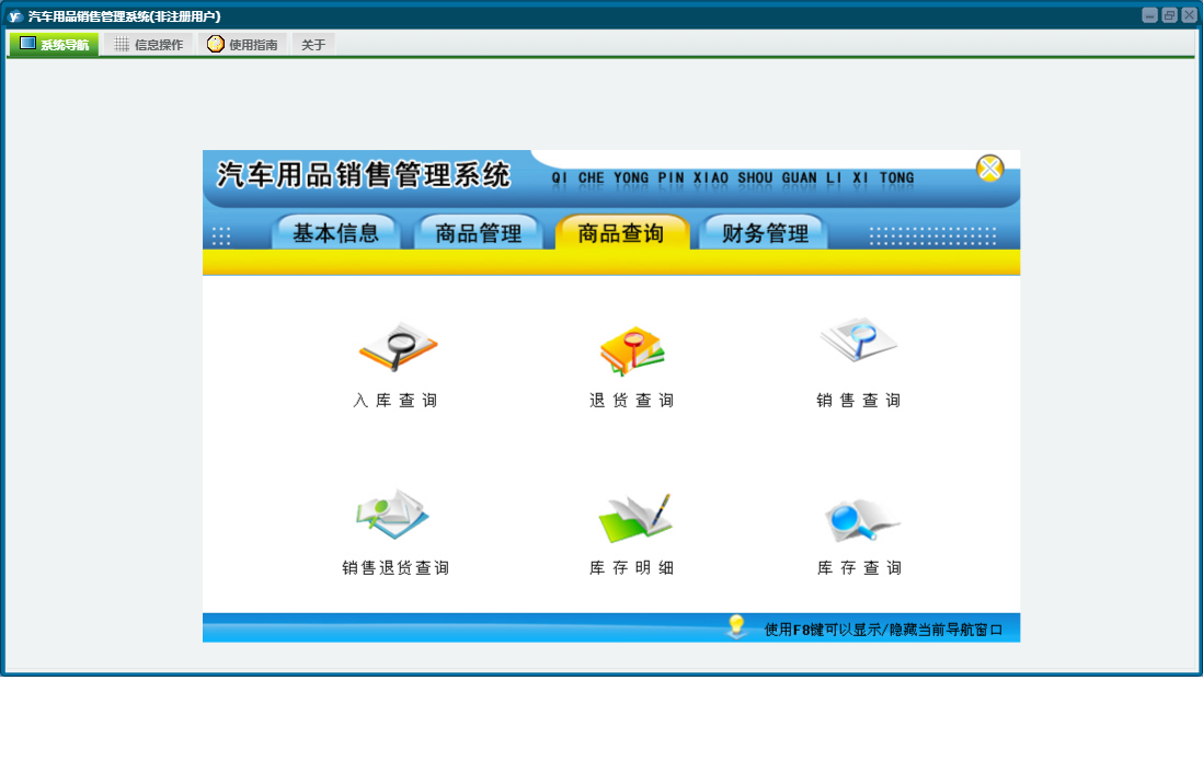 汽车用品销售管理系统包含以下功能:商品入库、入库退货、商品销售、供货商还款、商品管理、单位信息、商品信息、供货商信息、销售退货、日志、关于、商品订货、基本信息、权限设置、商品查询、客户信息、财务管理、客户还款等