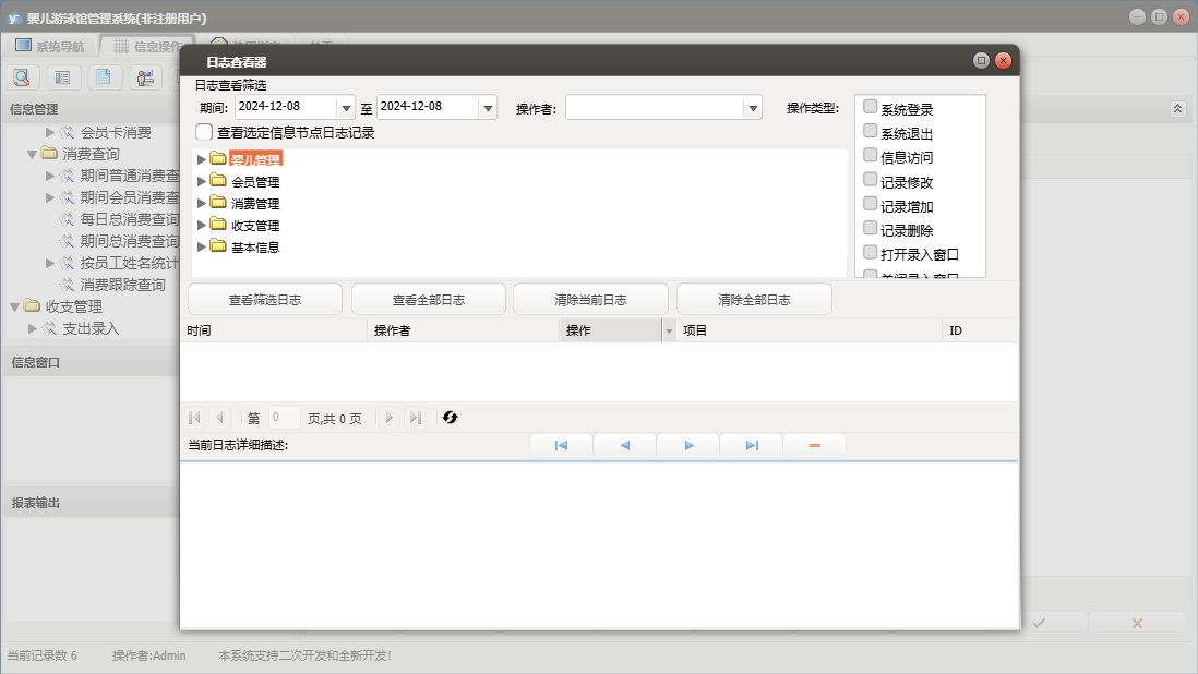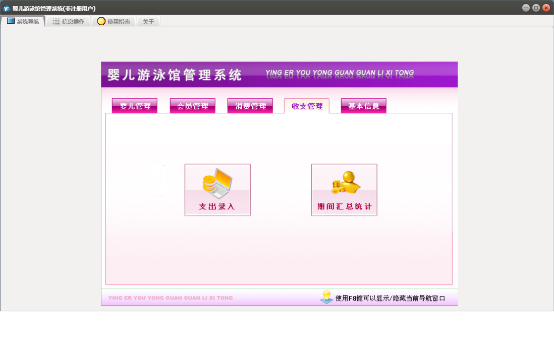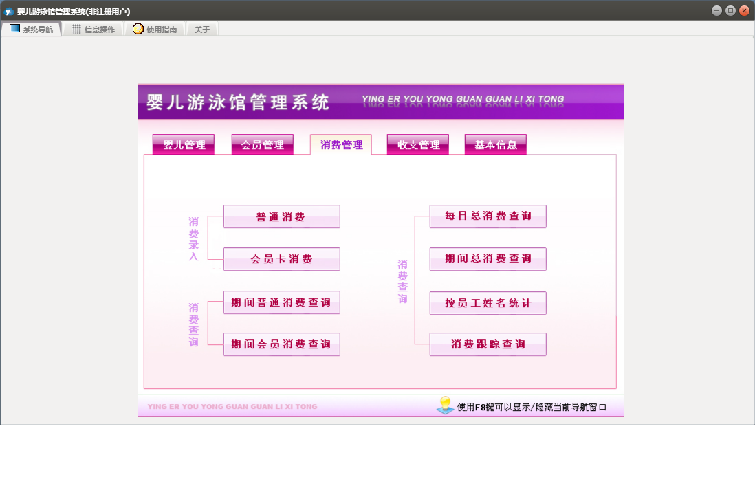 婴儿游泳馆管理系统包含以下功能:消费价目表、收支管理、普通消费、会员卡办理、会员卡开通、体格发育录入、会员生日提醒、会员卡禁用、婴儿信息修改、权限设置、会员卡修改、体格发育查询、婴儿信息录入、会员卡到期提醒、关于、会员卡消费、基本信息、消费管理、馆名、会员卡设置、会员卡充值、婴儿管理、会员管理、支出录入、员工信息、日志、会员退卡办理、信息来源等
