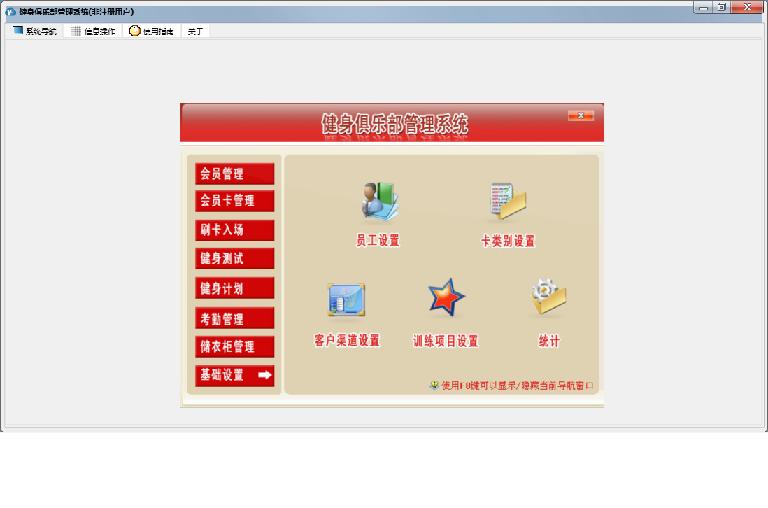 健身俱乐部管理系统包含以下功能:刷卡入场、退卡、续卡、考勤管理、请假、充消费金、卡类别设置、员工设置、基础数据、考勤数据整理、权限设置、储衣柜类别设置、转卡型、排班、客户渠道设置、训练项目设置、健身测试、关于、会员卡管理、班次设定、会员登记、会员资料查询及修改、健身计划、会员管理、储衣柜管理、禁用、日志、增加用户、投诉等