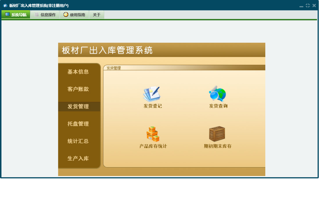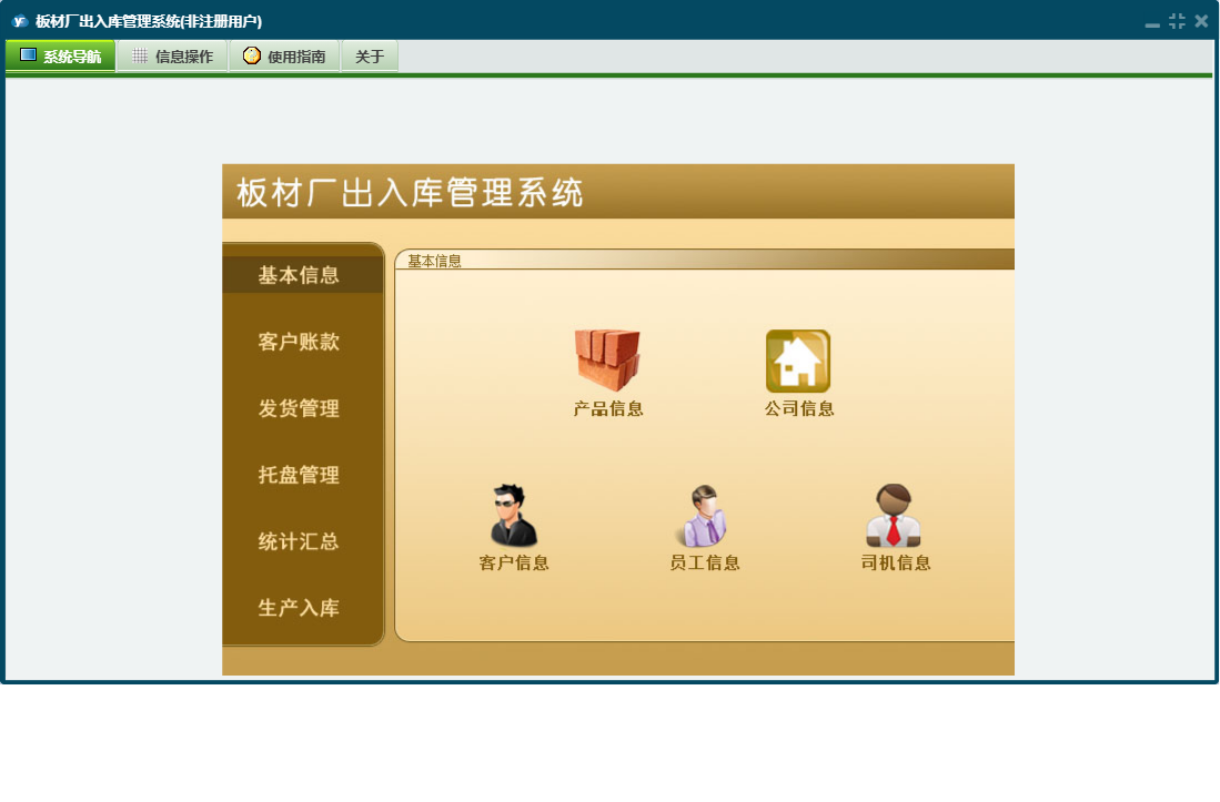 板材厂出入库管理系统包含以下功能:托盘入库、产品信息、发货登记、产品盘点、统计汇总、入库登记、公司信息、权限设置、客户付款登记、托盘返还登记、托盘报损、关于、基本信息、托盘管理、客户信息、发货管理、生产入库、司机信息、员工信息、日志、客户账款等