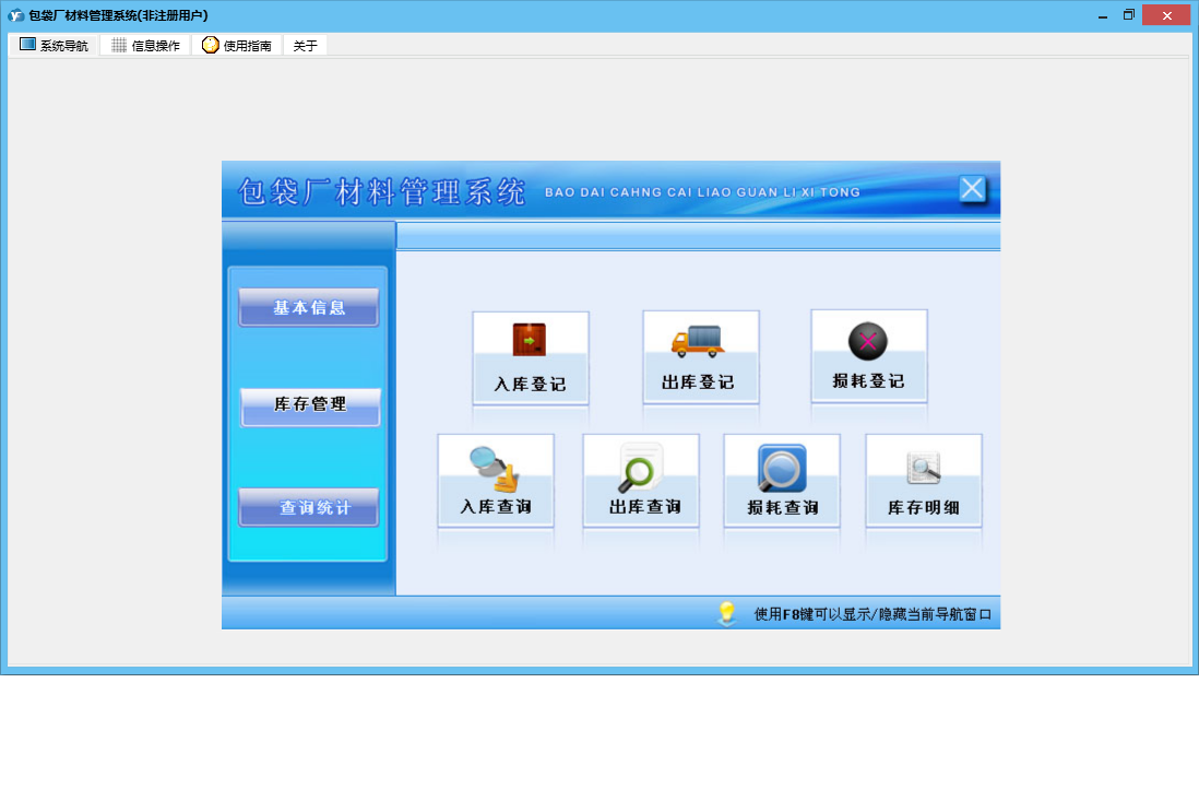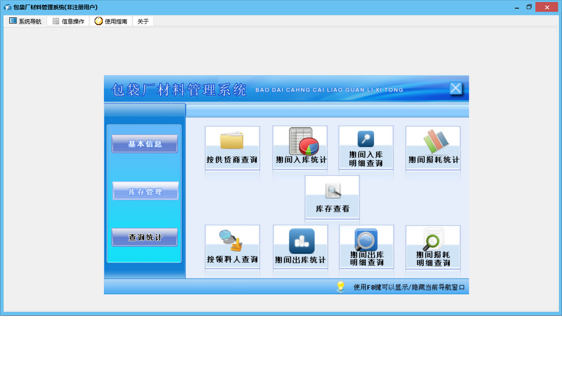 包袋厂材料管理系统包含以下功能:查询统计、基本设置、出库登记、入库查询、入库登记、材料信息、损耗查询、权限设置、组名设置、损耗登记、出库查询、库存管理、关于、供货商类别、员工信息、供货商信息、日志、材料类别、员工类别等