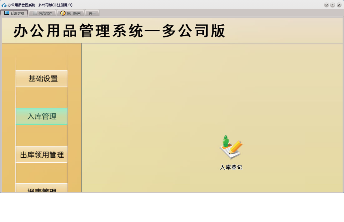 办公用品管理系统—多公司版包含以下功能:入库管理、基础设置、领用登记、库存预警、公司名称设置、入库登记、日志、办公用品基础信息、关于、公司人员设置、权限设置、报表管理、出库领用管理、公司部门设置等