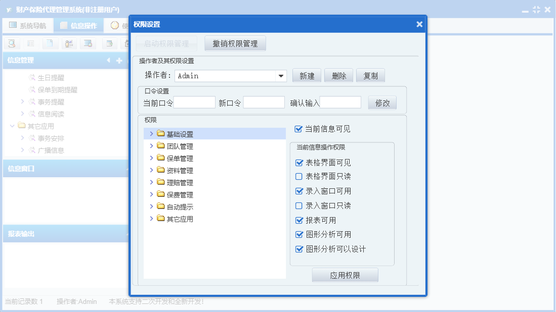 财产保险代理管理系统包含以下功能:财险录入、基础设置、团队成员信息录入、保费交纳、财险附加险、理赔录入、资料管理、财险名称、保单管理、保费管理、其他应用、自动提示、权限设置、货运保险、关于、理赔管理、事务安排、事务提醒、信息阅读、广播信息、团队管理、日志等