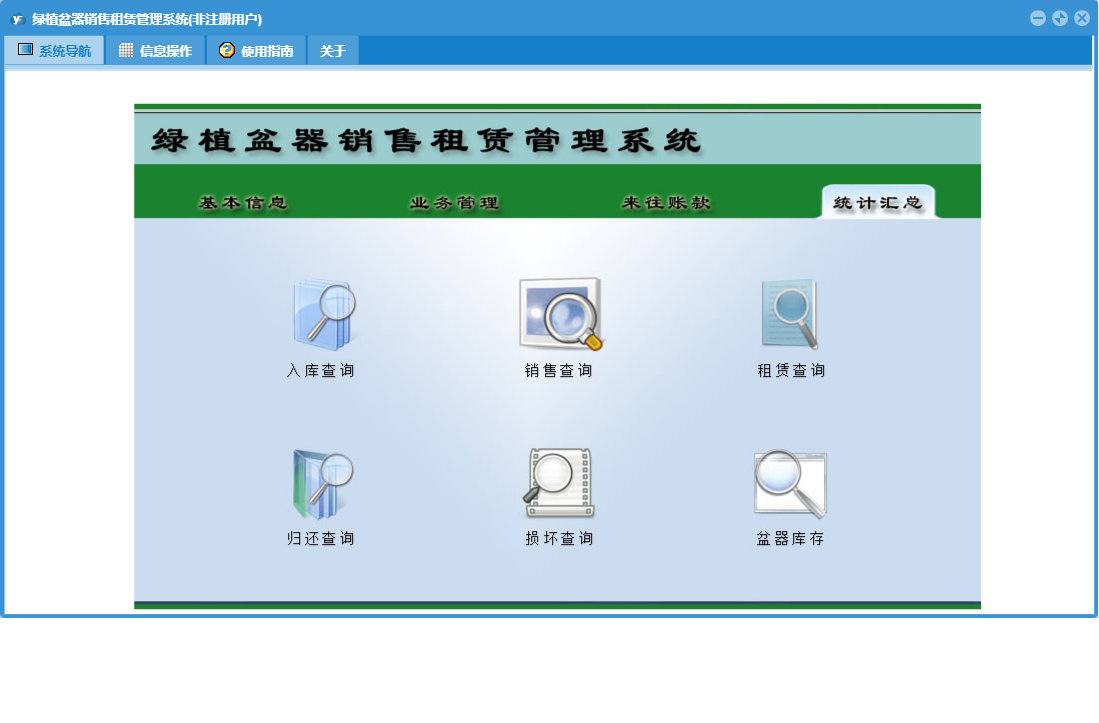 绿植盆器销售租赁管理系统包含以下功能:客户付款、盆器入库、供商信息、盆器租赁、日志、来往账款、盆器销售、关于、盆器归还、权限设置、盆器损坏、基本信息、客户信息、统计汇总、付供商款、业务管理等