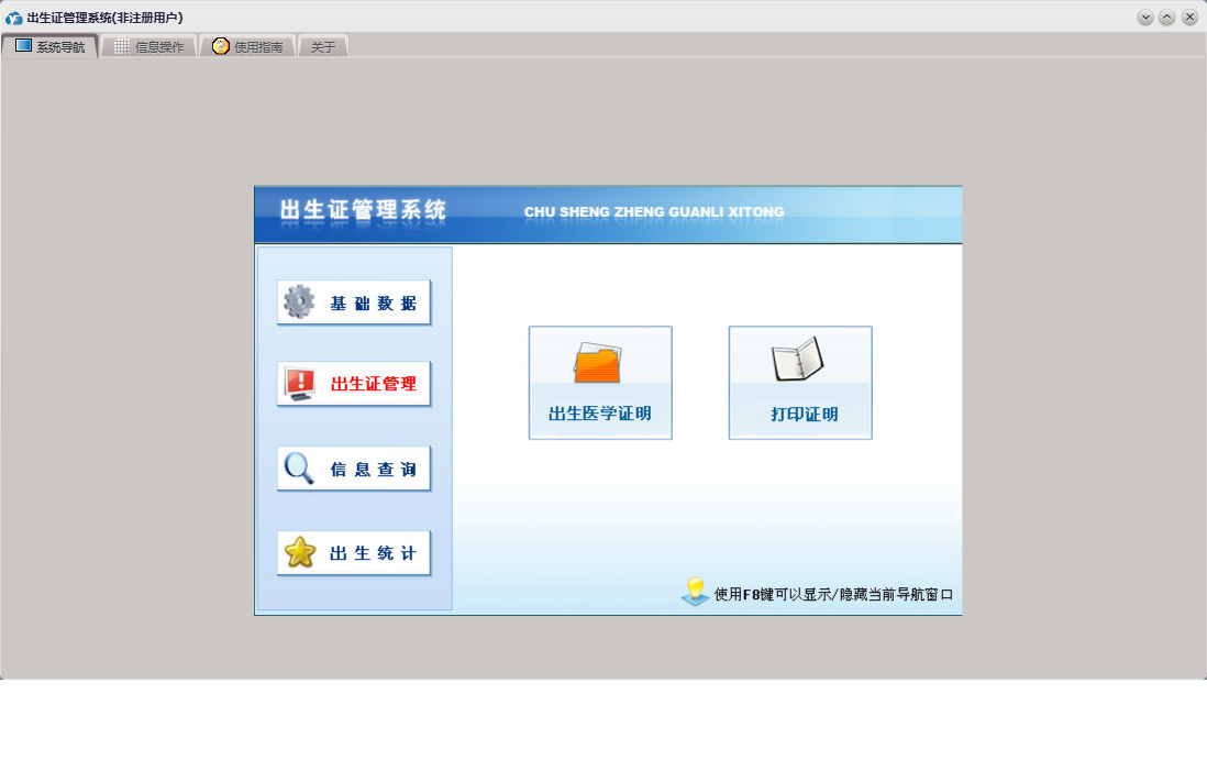 出生证管理系统包含以下功能:民族、基础数据、出生证管理、出生统计、国籍、省市县乡、日志、关于、权限设置、出生医学证明、信息查询、接生员、接生机构、签证机构等