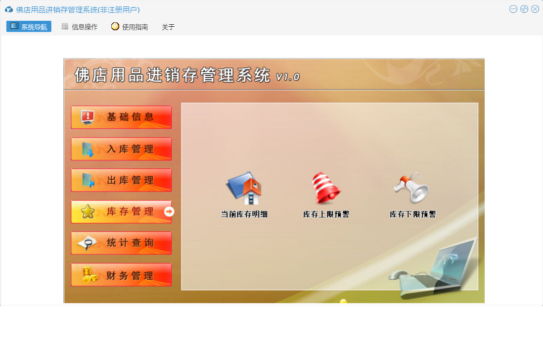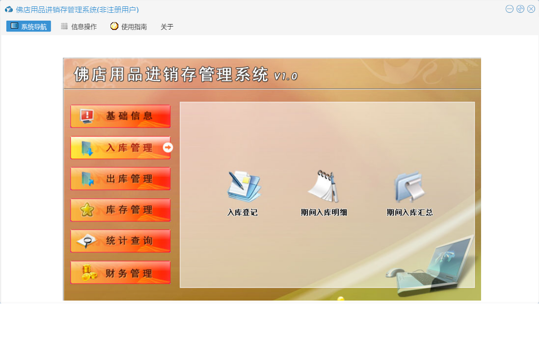 佛店用品进销存管理系统包含以下功能:出库管理、入库管理、基础信息、货品信息、入库登记、供货商信息、出库登记、其它收入登记、日志、其它支出登记、库存管理、关于、权限设置、统计查询、财务管理、仓库信息、人员信息等