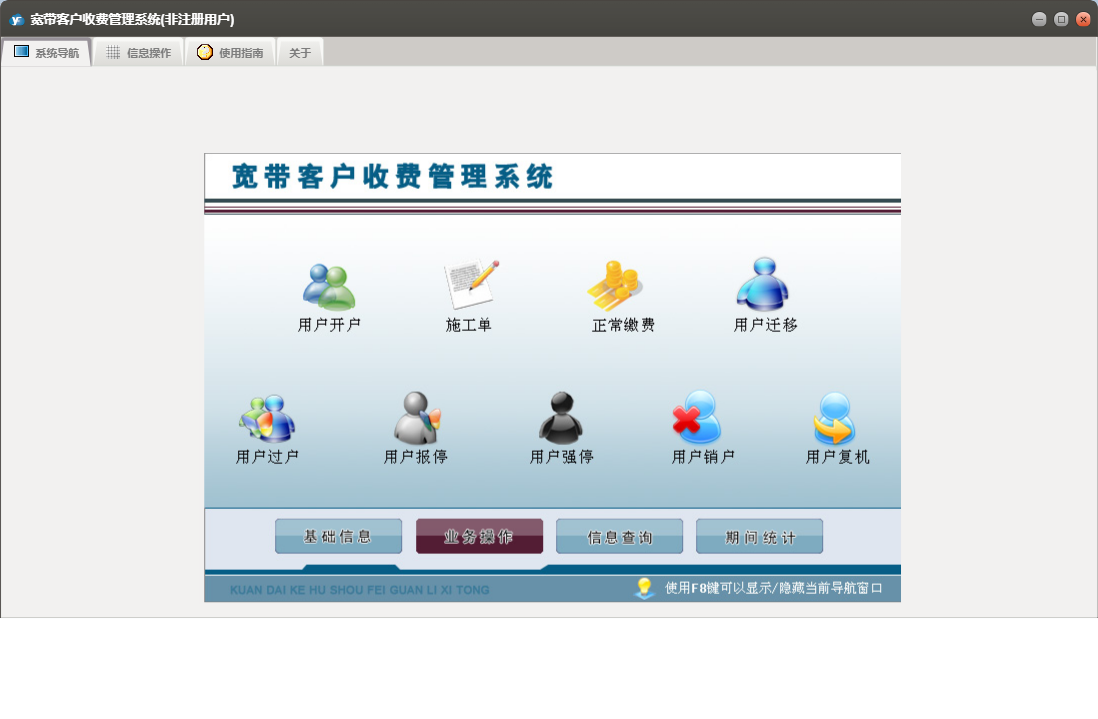 宽带客户收费管理系统包含以下功能:用户过户、用户复机、用户报停、安装人员、正常缴费、用户开户、用户强停、业务操作、用户销户、权限设置、用户迁移、信息查询、材料列表、小区设置、套餐设置、关于、基础信息、期间统计、施工单、员工信息、日志等
