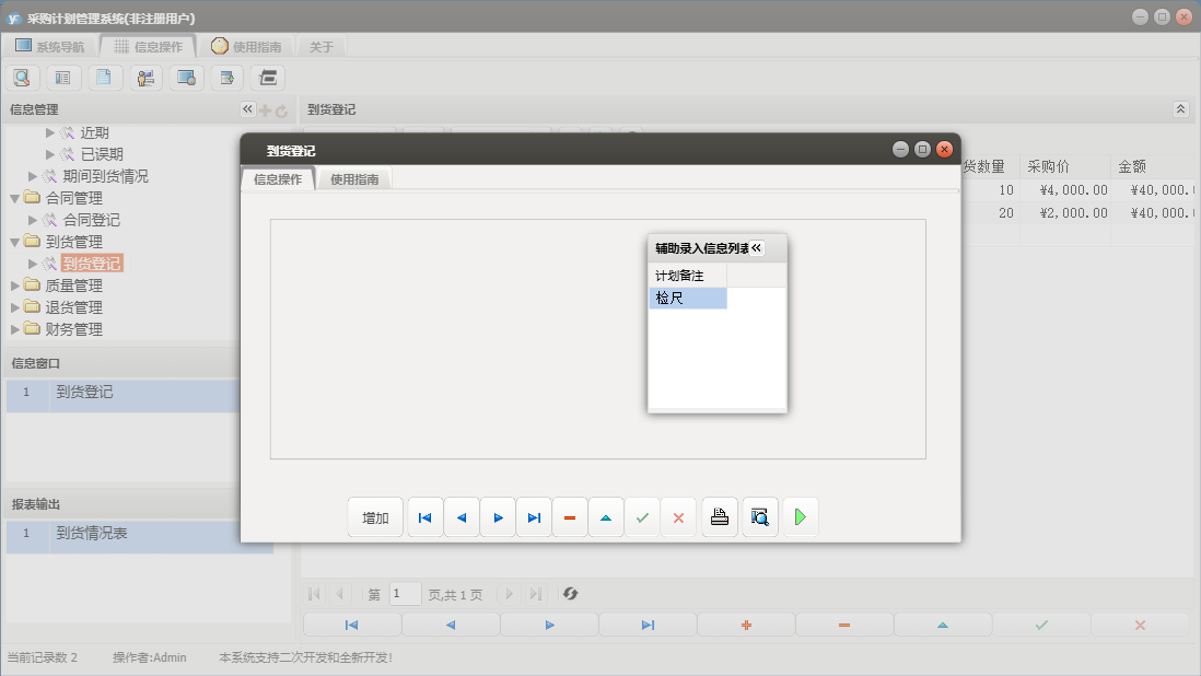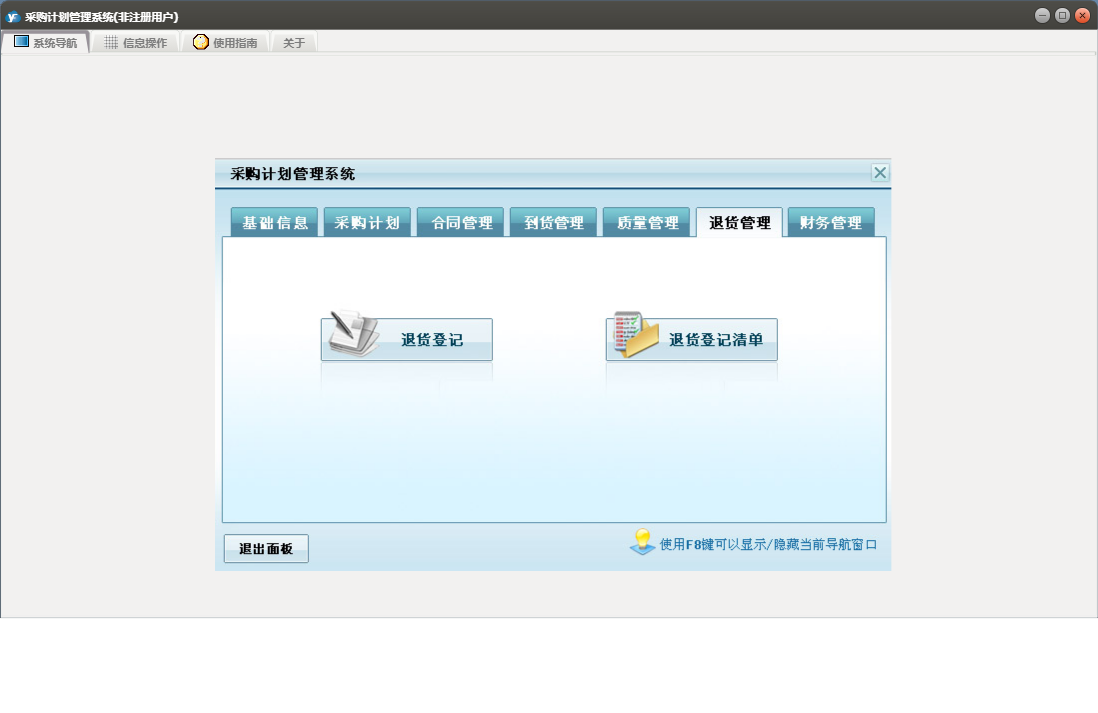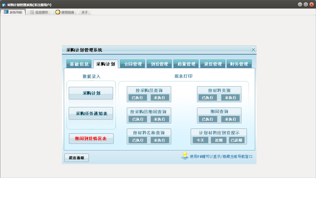 采购计划管理系统包含以下功能:供商及材料价格、合同登记、财务管理、本单位信息、退货登记、退货管理、付款登记、权限设置、关于、基本信息、合同管理、采购计划、到货管理、质量检验通知单、日志、到货登记、采购员信息、质量管理、帐务往来录入等