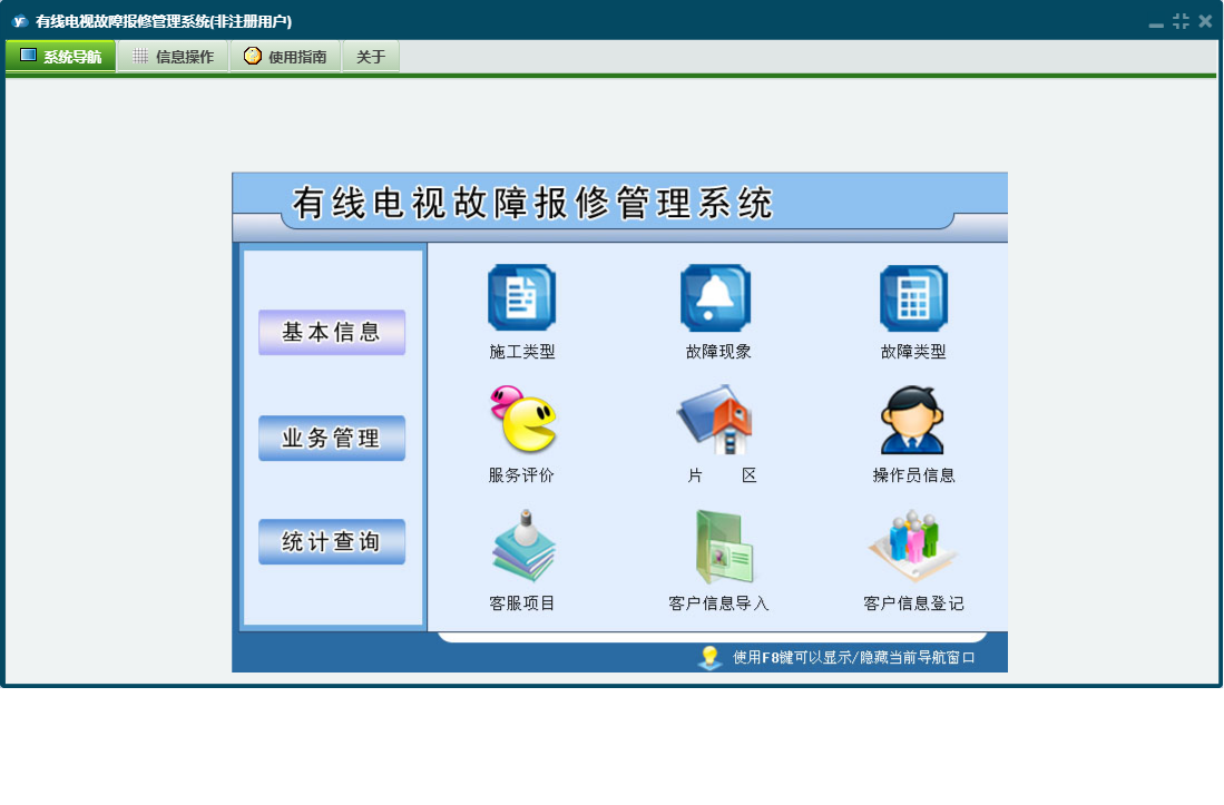 有线电视故障报修管理系统包含以下功能:客服登记、日志、关于、客户信息登记、操作员信息、派工登记、权限设置、完工登记、基本信息、统计查询、回访登记、业务管理等