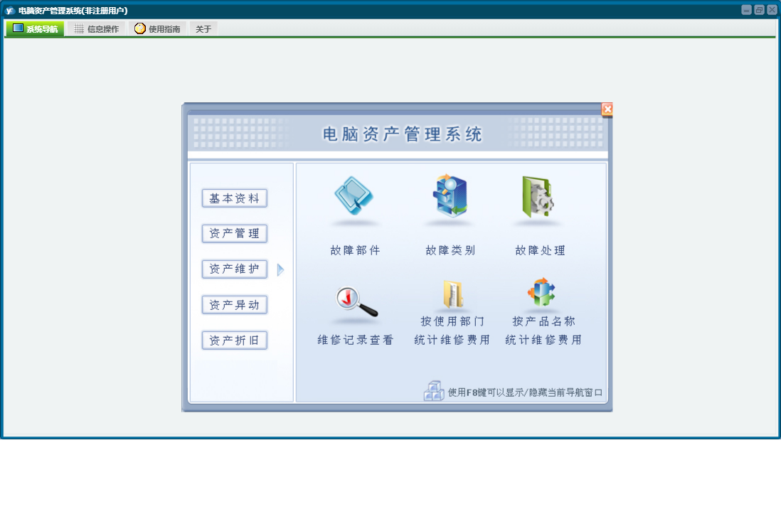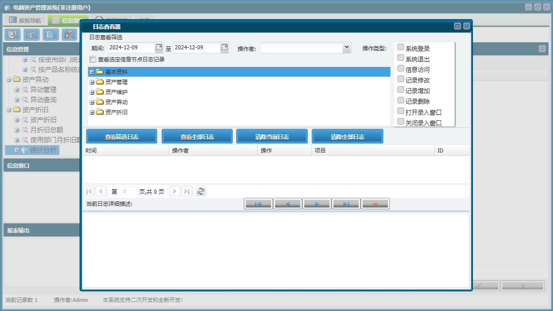 电脑资产管理系统包含以下功能:公司、资产类别、部门、资产维护、资产折旧、资产异动、权限设置、品牌、基本资料、员工、故障处理、故障类别、关于、故障部件、异动管理、资产状态、型号、日志、资产管理、供应商等