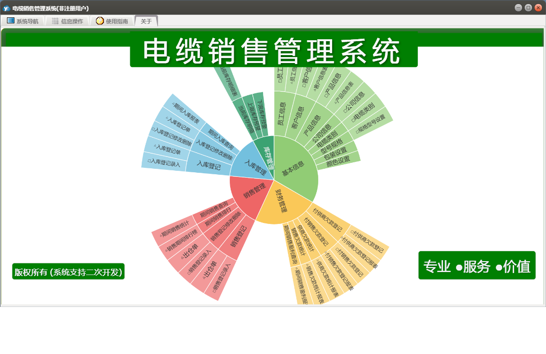电缆销售管理系统包含以下功能:电缆类别、销售管理、产品信息、财务管理、付供商欠款登记、入库登记修改删除、入库登记、公司信息、权限设置、库存管理、型号规格、关于、销售登记、基本信息、客户信息、销售登记修改删除、付销售欠款登记、入库管理、员工信息、日志等