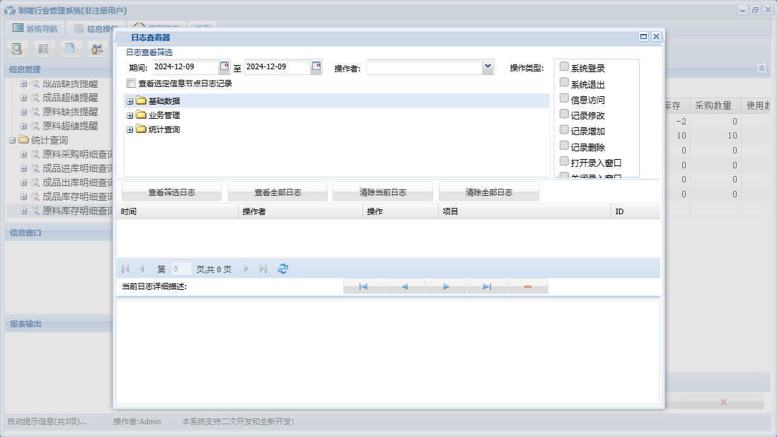 制罐行业管理系统包含以下功能:成品类别、成品进库、成品信息、基础数据、资产信息、印刷派工、统计查询、权限设置、片材收料、原料类别、原料信息、卷材收料、关于、客户信息、业务管理、成品出库、员工信息、供货商收款单、供货商信息、日志、采购管理、剪切派工、计量单位等