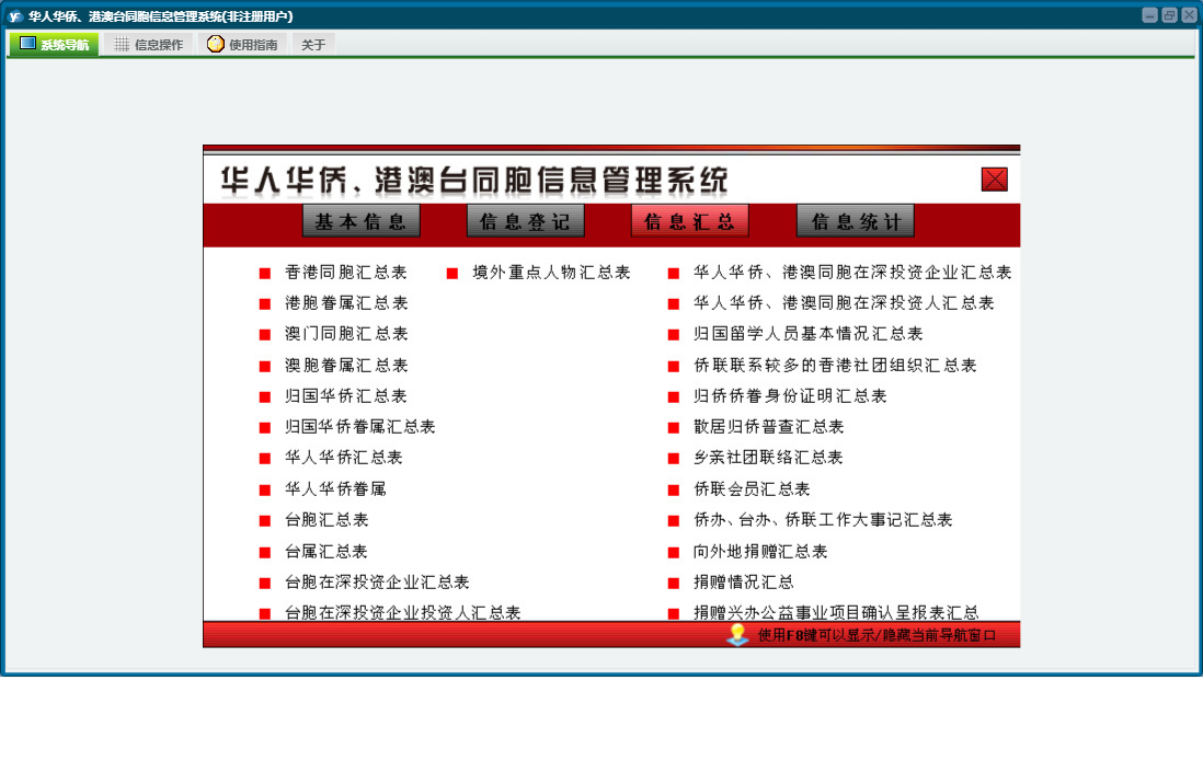 华人华侨、港澳台同胞信息管理系统包含以下功能:街道社区资料、捐赠兴办公益事业情况普查登记、港澳同胞及其眷属登记、归侨侨眷身份证明、华侨华人、港澳同胞在深投资企业登记、职业、信息登记、侨办台办侨联工作大事记、侨务资源普查、职务、侨联个人会员登记申请、境外重点人物情况、信息汇总、权限设置、归国华侨及其眷属登记、散居归侨普查登记、民族、政治面貌、联系多的香港社团、台胞台属登记、台资企业、信息统计、文化程度、关于、基本信息、与户主关系、股份公司增加数、华人华侨及其眷属登记、台胞在深投资企业登记、乡亲社团联络登记、日志、捐赠项目确认呈报、归国留学人员基本情况调查、职称、向外地捐赠等