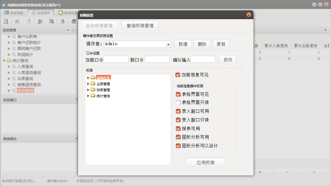 电脑耗材销售管理系统包含以下功能:商品入库、入库退货、基础信息、商品信息、员工信息、供货商收款单、供货商信息、销售退货、日志、关于、权限设置、统计查询、销售出库、客户信息、客户还款单、财务管理、仓库信息、业务管理等