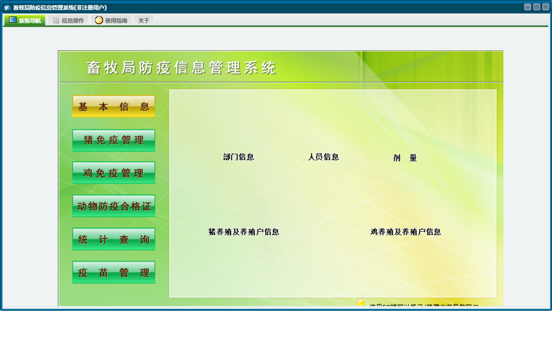 畜牧局防疫信息管理系统包含以下功能:基础信息、猪免疫信息、鸡免疫信息、历史信息查询、疫苗入库、动物防疫合格证、鸡免疫管理、日志、鸡养殖及养殖户信息、关于、权限设置、统计查询、疫苗管理、部门信息、当日工作情况录入、猪免疫管理、猪养殖及养殖户信息、人员信息等
