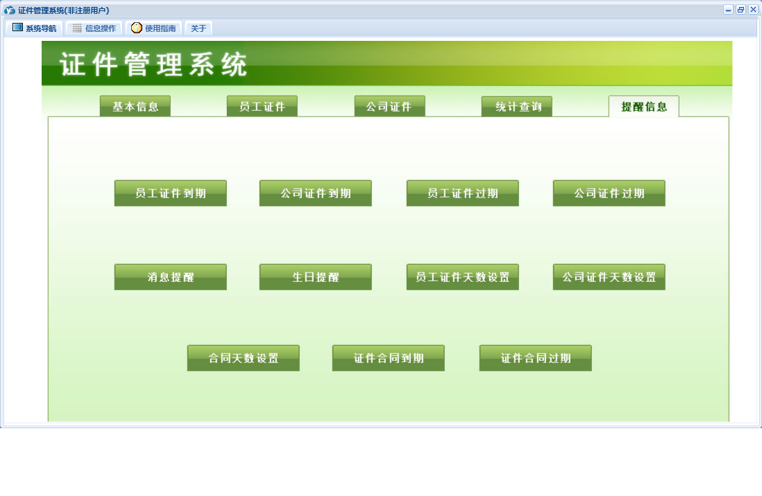 证件管理系统包含以下功能:职工信息、往来单位、证件合同、证件登记、证件出借、公司证件、证件类别、公司信息、员工证件、日志、关于、合同登记、基本信息、权限设置、统计查询、提醒信息、证件培训、消息信息等