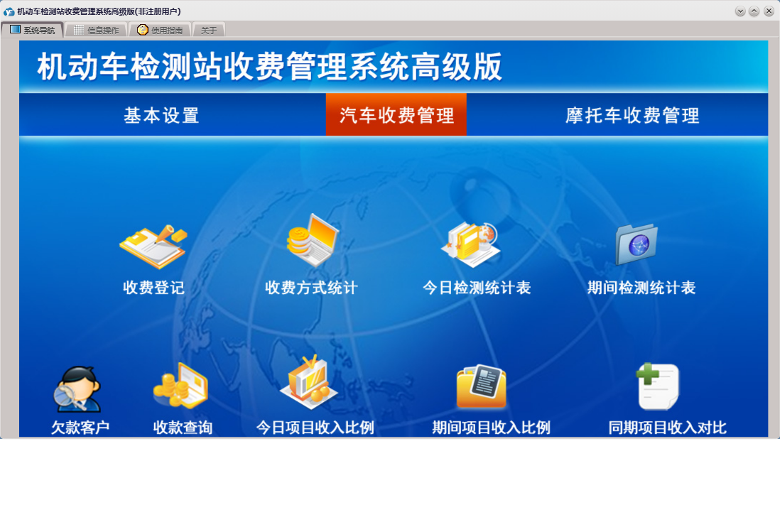 机动车检测站收费管理系统高级版包含以下功能:摩托车收费项目设置、基本设置、日志、摩托车、汽车收费、关于、权限设置、汽车收费项目设置、欠款客户明细、收费登记等