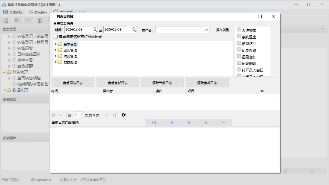 陶瓷行业销售管理系统包含以下功能:销售登记(管理员)、销售登记(销售员)、数据处理、入库登记、商品信息、员工信息、销售退货、日志、关于、权限设置、基本信息、财务管理、业务管理等