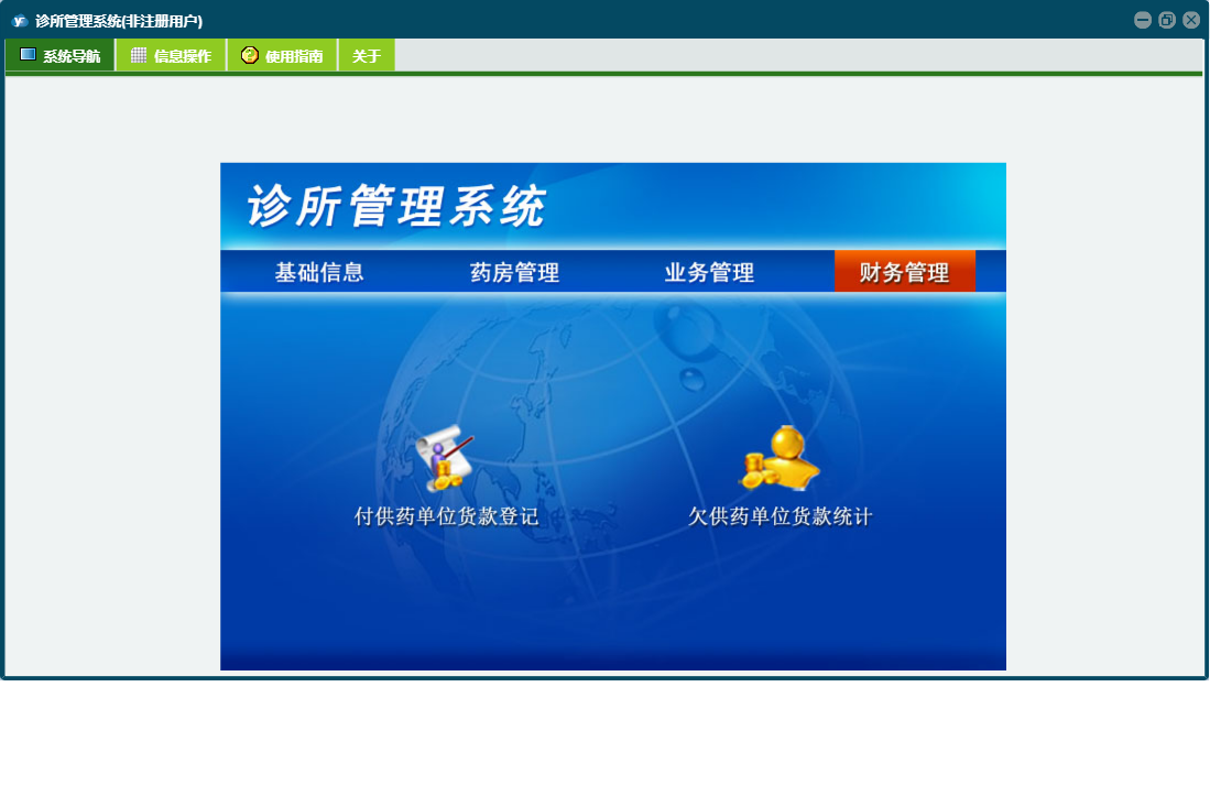 诊所管理系统包含以下功能:供药单位、基础信息、财务管理、药品信息、付供药单位货款登记、药品退货、药品入库、就诊登记、日志、患者欠款查询、关于、权限设置、药房管理、收费登记、业务管理、人员信息等