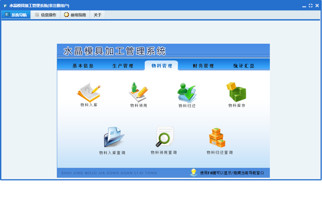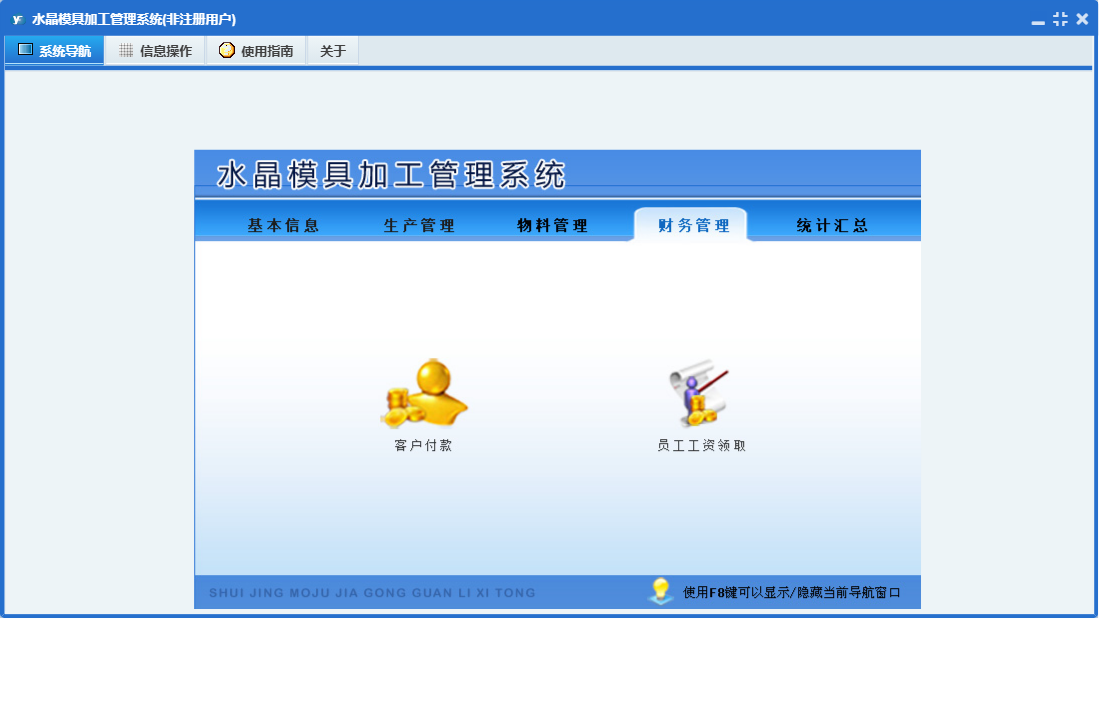 水晶模具加工管理系统包含以下功能:物料信息、物料入库、统计汇总、财务管理、员工工资领取、权限设置、销售出库、工序名称、物料归还、包装管理、关于、基本信息、物料管理、物料领用、客户付款、员工信息、产品入库、材料采购、客户订单、日志、生产管理等