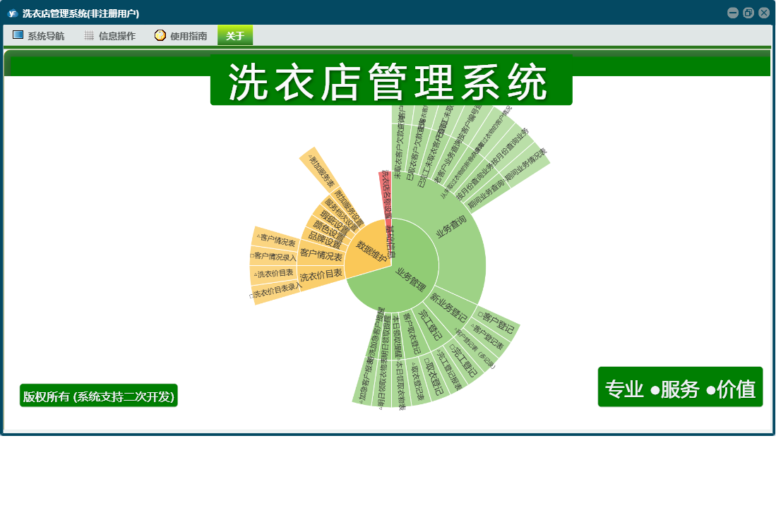 洗衣店管理系统包含以下功能:客户取衣登记、客户情况表、新业务登记、基础信息、业务提醒、洗衣价目表、日志、业务登记、关于、权限设置、业务查询、完工登记等