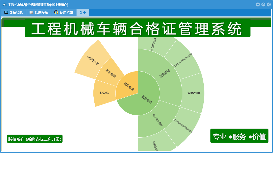 工程机械车辆合格证管理系统包含以下功能:信息登记、1、单位信息、日志、关于、权限设置等