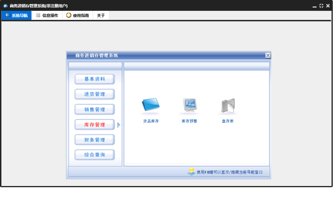 商务进销存管理系统包含以下功能:进货退货、销售管理、货品信息、进货单、综合查询、财务管理、销售单、销售退货、权限设置、仓库信息、基本资料、盘存表、库存管理、销售收款、关于、客户信息、进货付款、进货管理、日志、供商信息等