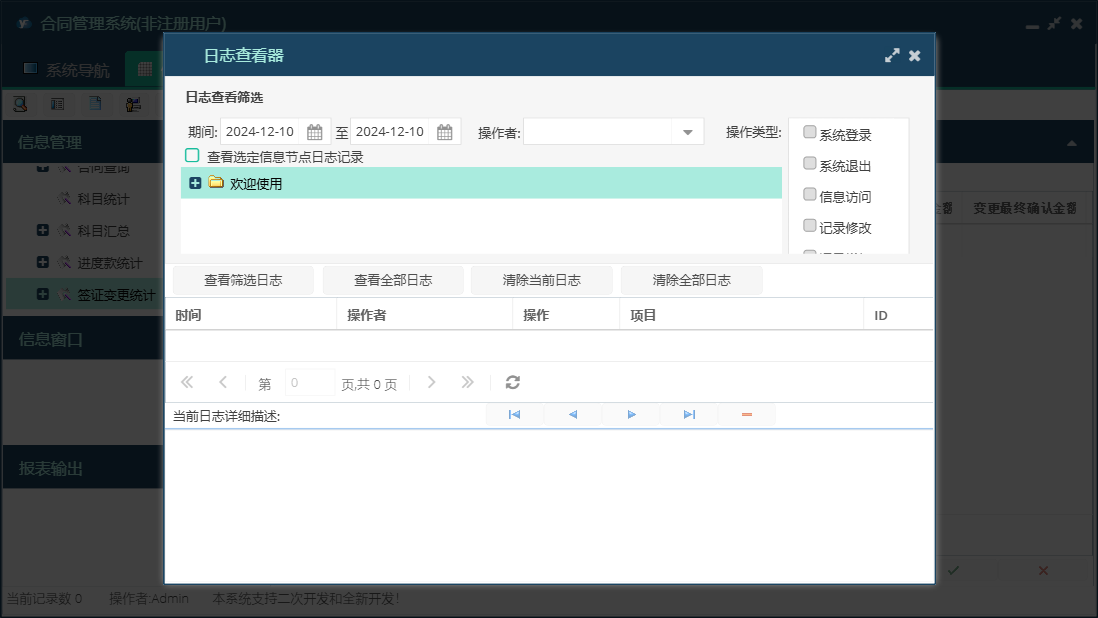 合同管理系统包含以下功能:面板、日志、关于、合同登记、权限设置、合同查询等