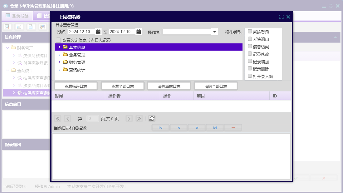 食堂下单采购管理系统包含以下功能:货品信息、查询统计、员工信息、日志、付供商款登记、食堂信息、关于、基本信息、权限设置、业务管理、财务管理、供商信息等