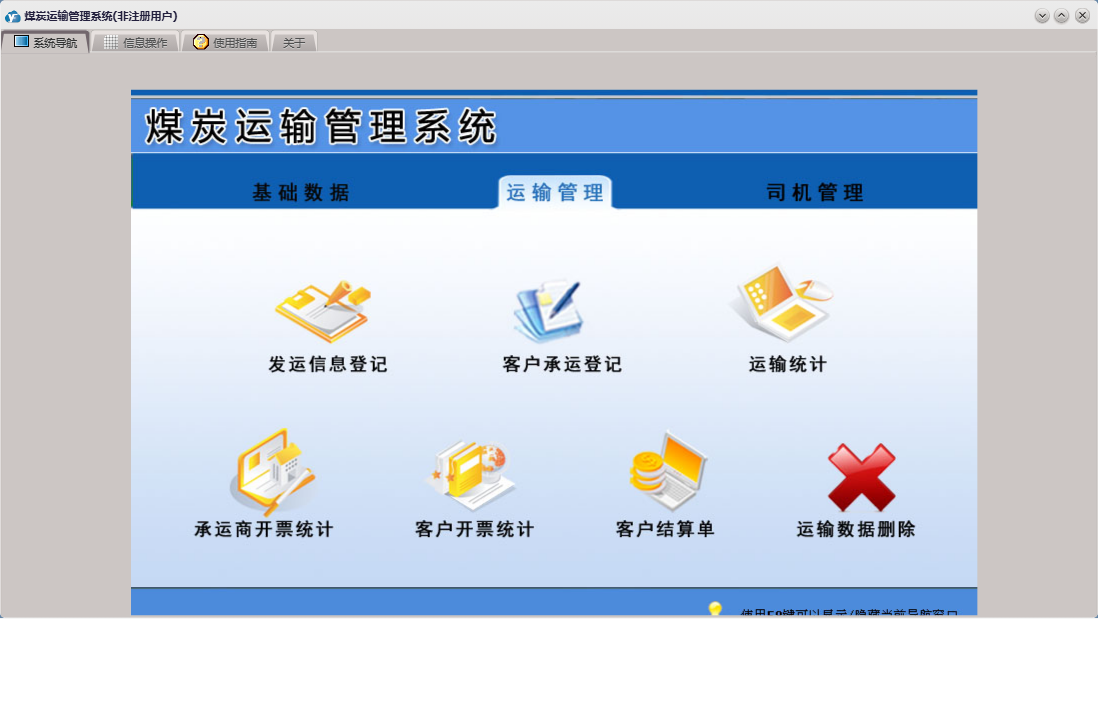 煤炭运输管理系统包含以下功能:基础数据、线路信息、运输管理、客户信息、承运商运费设置、承运商信息、发运信息登记、司机信息、客户承运登记、客户运费设置、日志、司机运费登记、关于、司机运费设置、权限设置、客户结算单、司机管理、车辆信息等