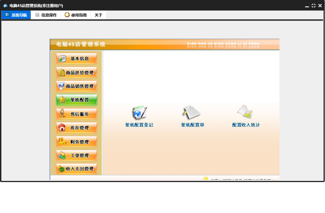 电脑4S店管理系统包含以下功能:供货商信息登记、仓库商品登记、收入支出管理、商品退货、售后服务、公司信息设置、财务管理、商品信息登记、工资管理、商品进货管理、仓库信息登记、库存管理、客户信息登记、关于、基本信息、商品进货、商品销售、员工信息登记、商品销售管理、装机配置等