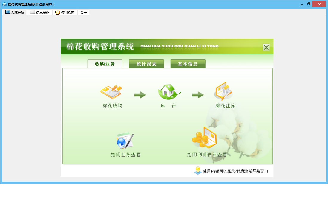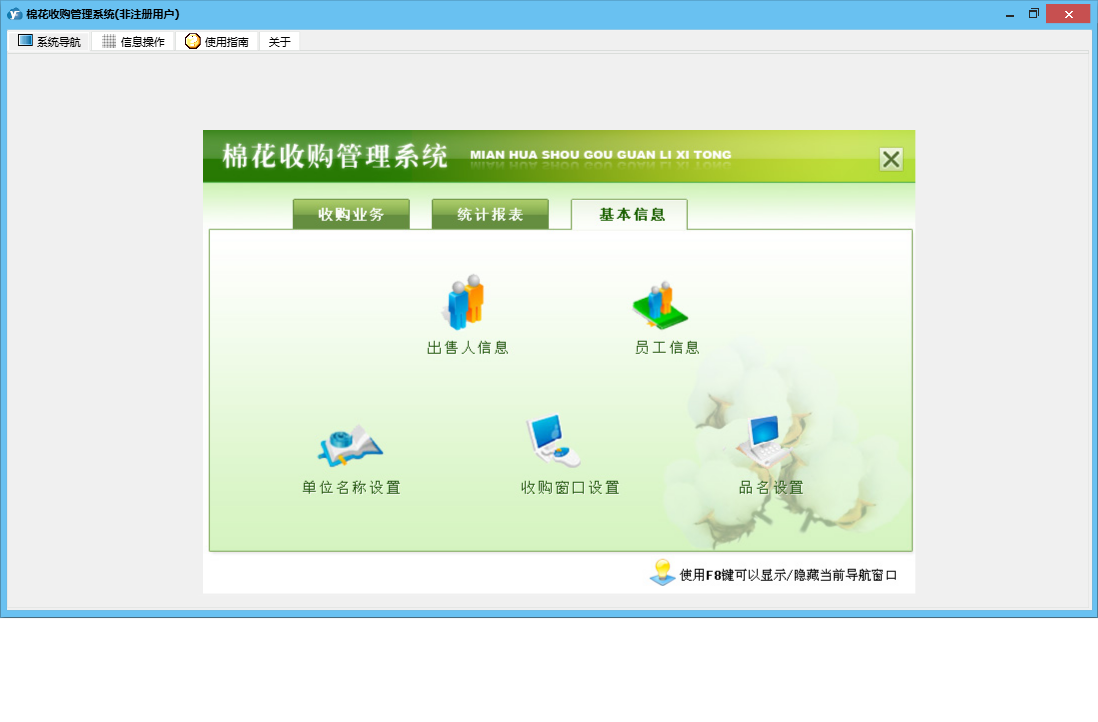 棉花收购管理系统包含以下功能:出售人信息、收购业务、员工信息、日志、关于、权限设置、统计、棉花出库、棉花收购、参数设置等