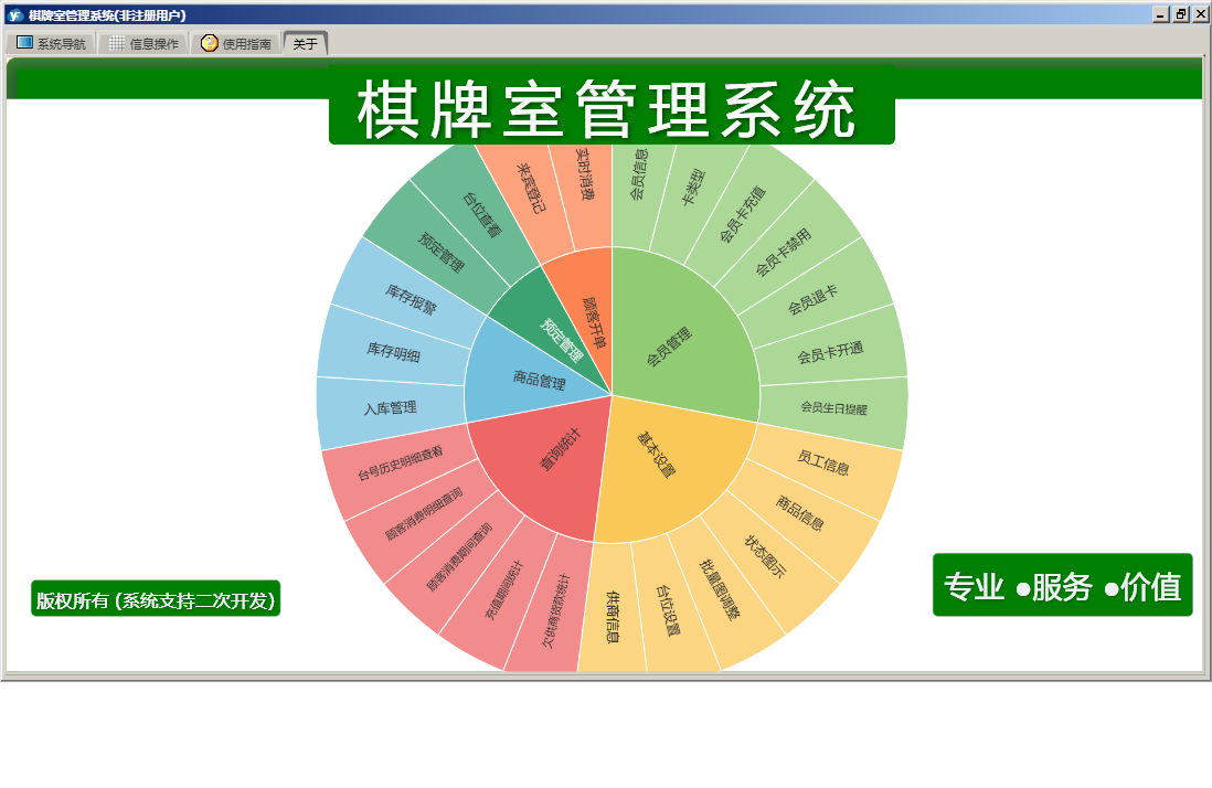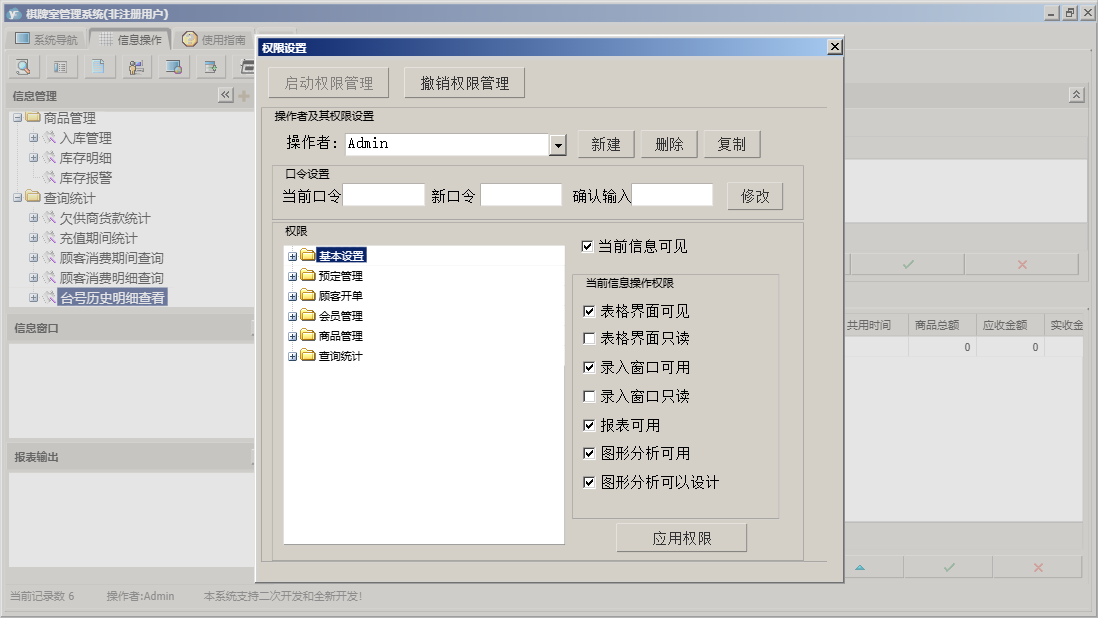 棋牌室管理系统包含以下功能:顾客开单、会员信息、查询统计、基本设置、卡类型、状态图示、来宾登记、会员卡开通、商品信息、会员卡禁用、权限设置、预定管理、台位查看、关于、会员卡充值、入库管理、商品管理、会员管理、员工信息、日志、台位设置、实时消费、会员退卡、台号历史明细查看、供商信息等