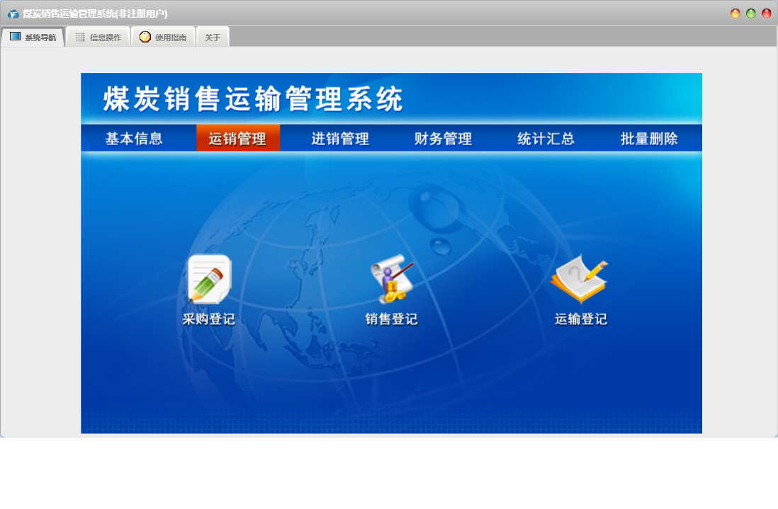 煤炭销售运输管理系统包含以下功能:出库登记、采购付款、运输结算、产品信息、统计汇总、进销管理、财务管理、入库登记、采购登记、权限设置、运销管理、运输登记、销售收款、关于、销售登记、基本信息、客户信息、车辆信息、批量删除、日志、供商信息等
