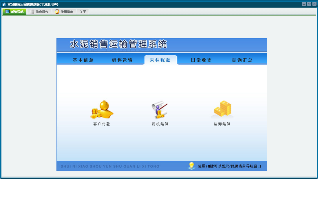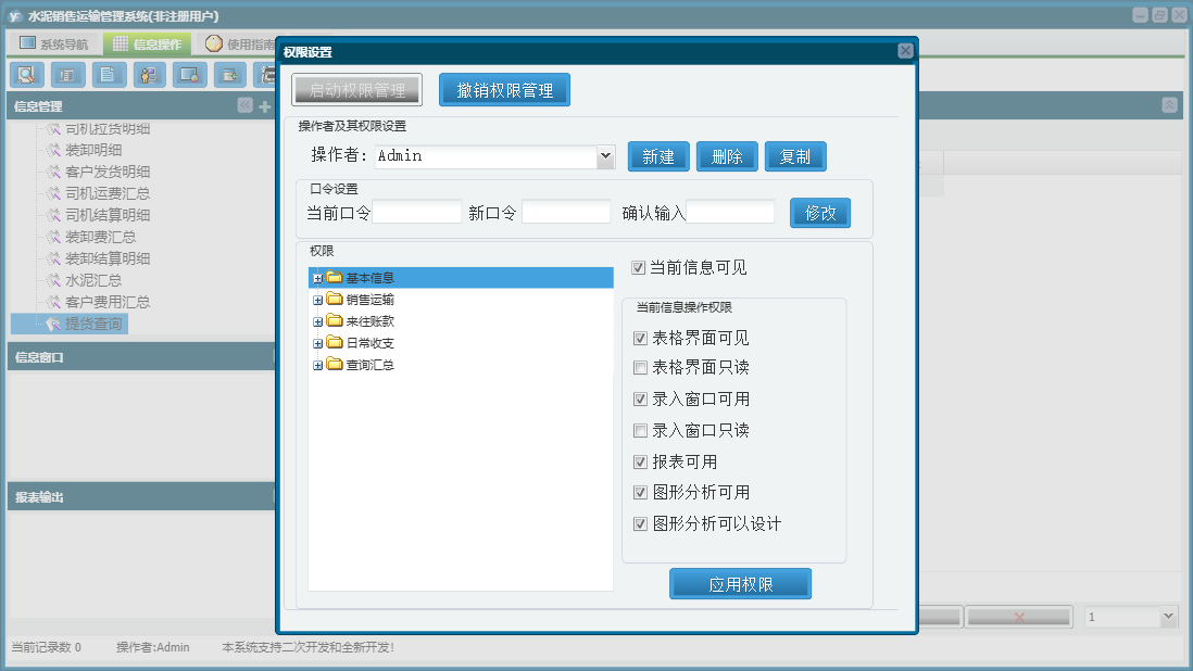 水泥销售运输管理系统包含以下功能:销售运输、客户付款、日常收支、客户开票、水泥管理、司机结算、客户管理、关于、基本信息、权限设置、日志、装卸结算、来往账款、查询汇总、装卸管理、提货出厂、车辆管理等