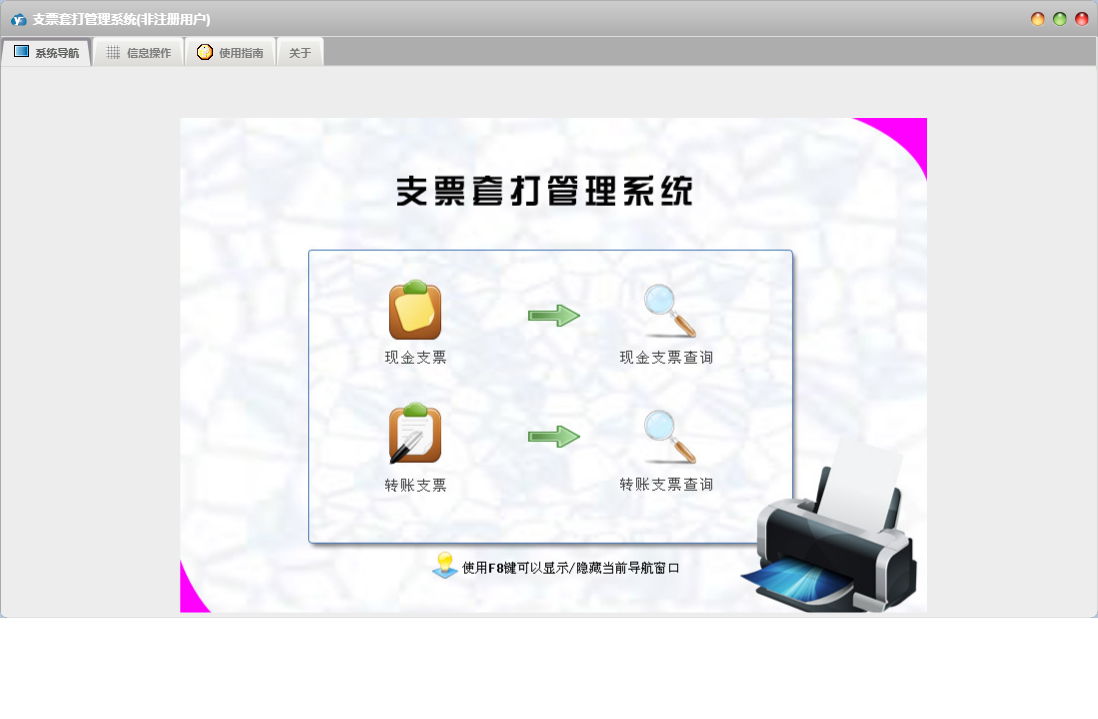 支票套打管理系统包含以下功能:现金支票查询、转账支票、日志、关于、权限设置、主板、现金支票、转账支票查询等