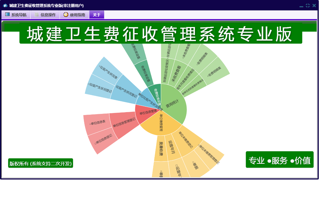 城建卫生费征收管理系统专业版包含以下功能:单位未缴费登记、单位信息管理登记、设置年月、日志、垃圾产生状况登记、关于、权限设置、收费标准设置、收费管理等