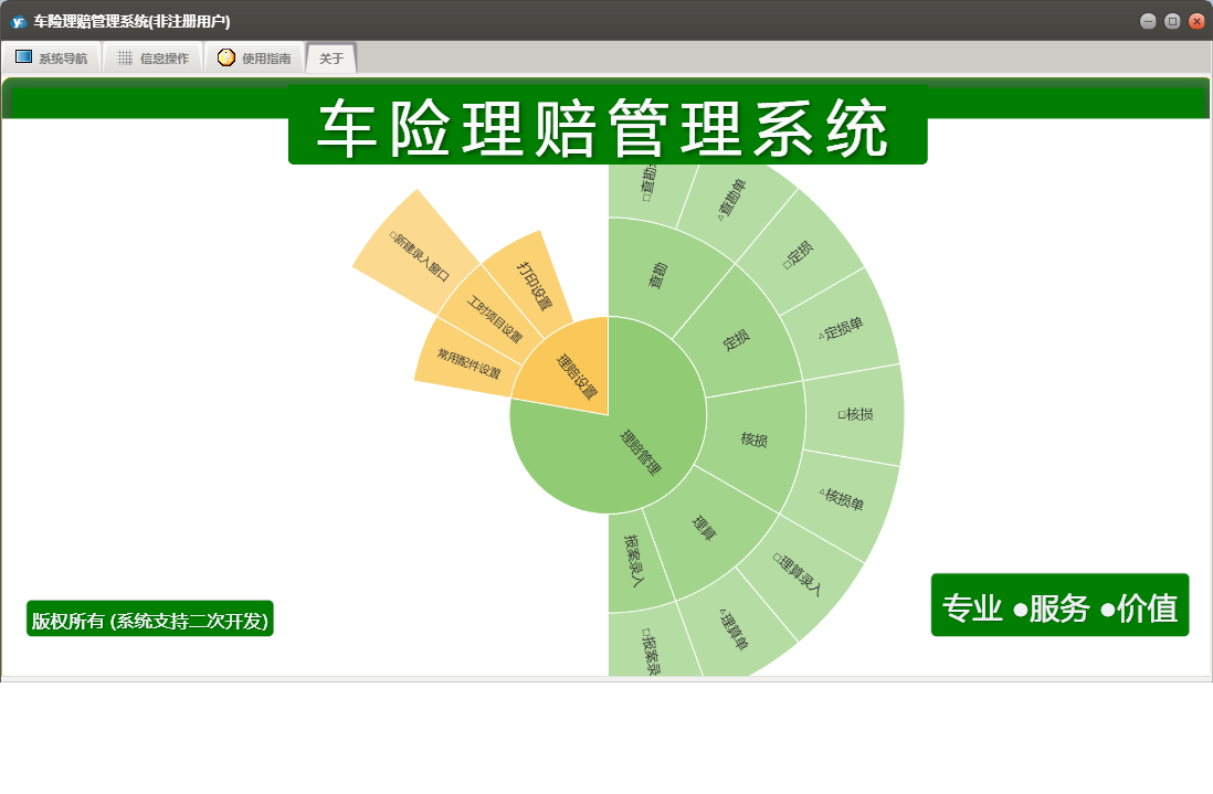 车险理赔管理系统包含以下功能:面板1、工时项目设置、定损、日志、理算、关于、权限设置、查勘、核损、报案录入等